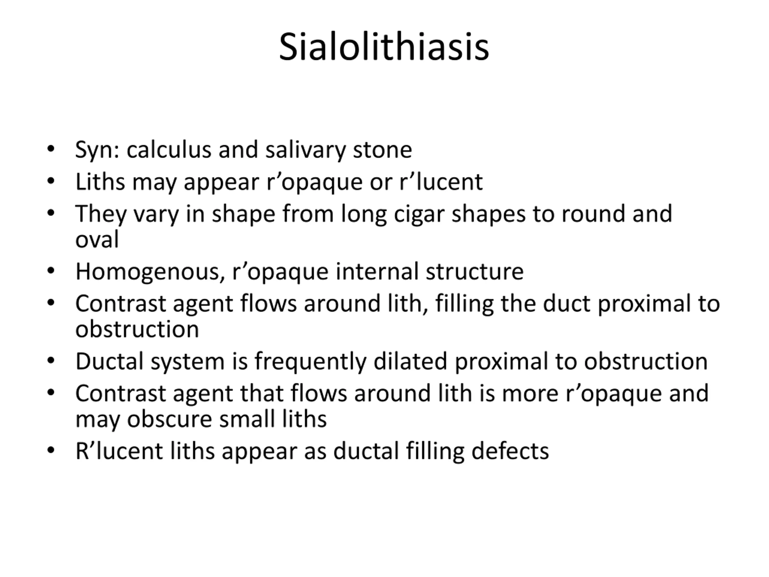Sialolithiasis Syn: calculus and salivary stone Liths may appear r opaque or r lucent They vary in shape from long cigar shapes to round and oval Homogenous, r opaque internal structure Contrast agent flows around lith, filling the duct proximal to obstruction Ductal system is frequently dilated proximal to obstruction Contrast agent that flows around lith is more r opaque and may obscure small liths R lucent liths appear as ductal filling defects