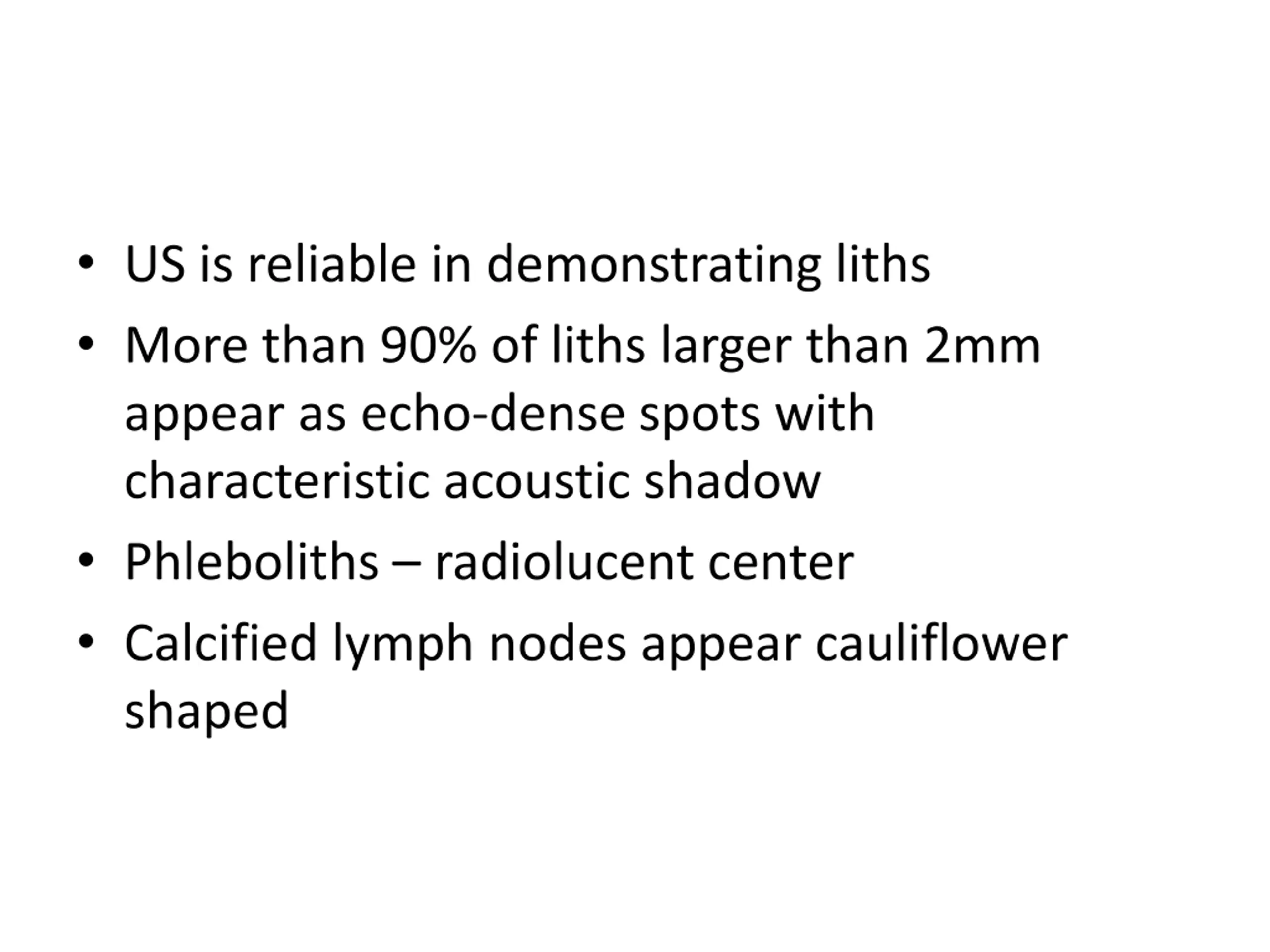 US is reliable in demonstrating liths More than 90% of liths larger than 2mm appear as echo-dense spots with characteristic acoustic shadow Phleboliths radiolucent center Calcified lymph nodes appear cauliflower shaped