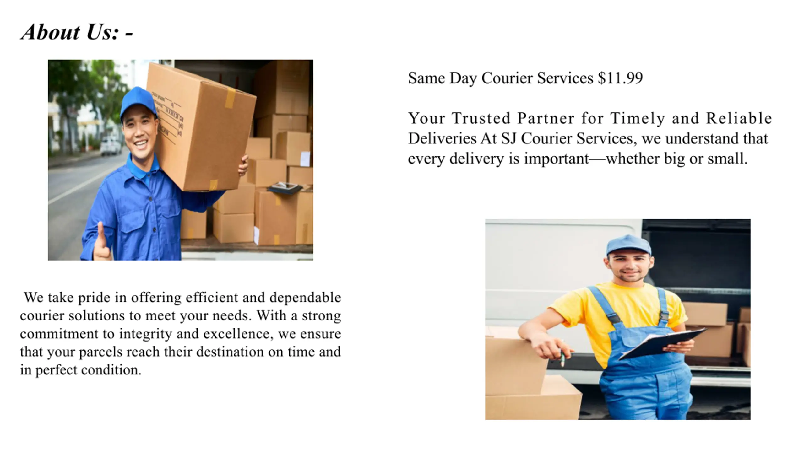 About Us: - Same Day Courier Services $11.99 Your Trusted Partner for Timely and Reliable Deliveries At SJ Courier Services, we understand that every delivery is important whether big or small. We take pride in offering efficient and dependable courier solutions to meet your needs. With a strong commitment to integrity and excellence, we ensure that your parcels reach their destination on time and in perfect condition.