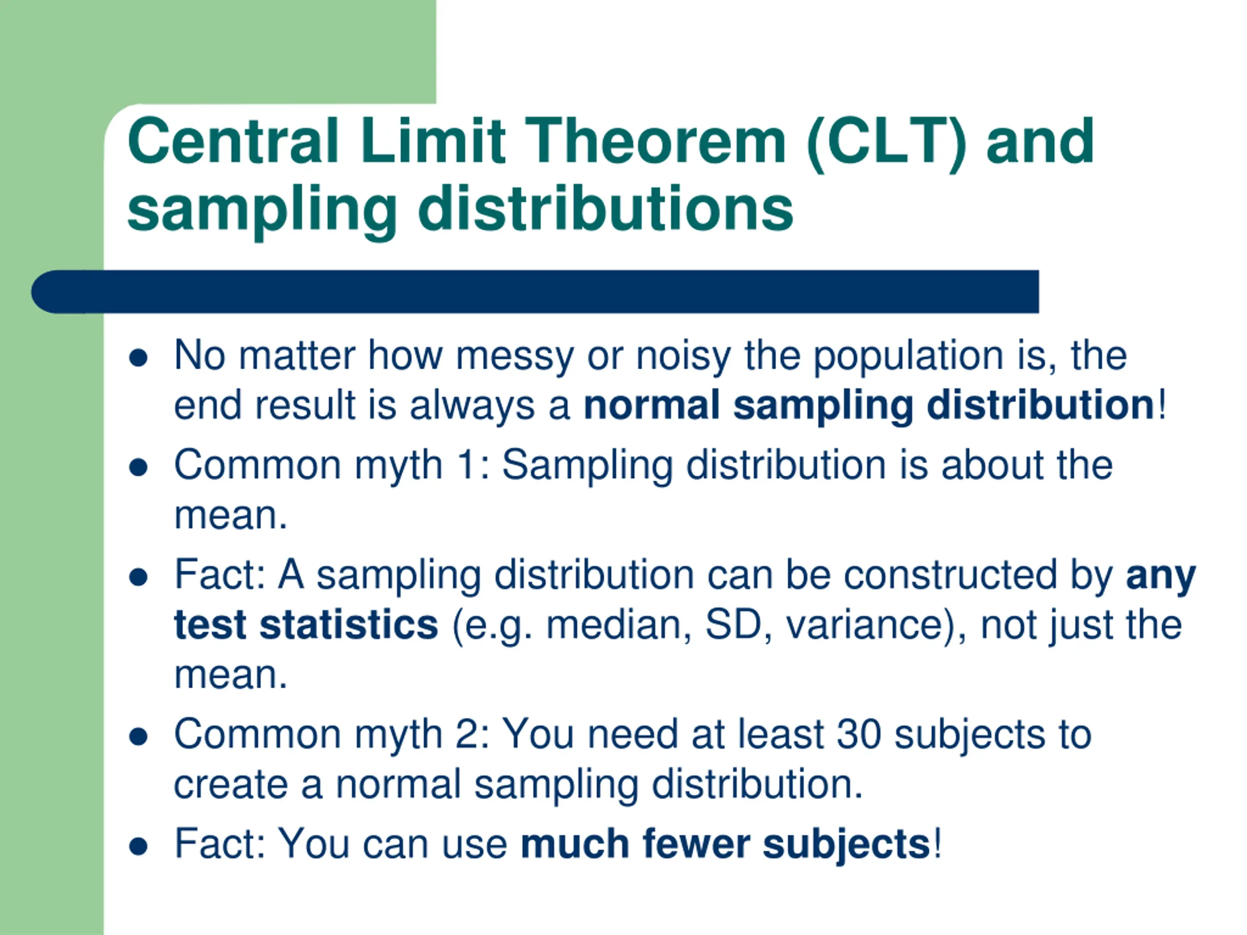 Central Limit Theorem (CLT) and sampling distributions No matter how messy or noisy the population is, the end result is always a normal sampling distribution! Common myth 1: Sampling distribution is about the mean. Fact: A sampling distribution can be constructed by any test statistics (e.g. median, SD, variance), not just the mean. Common myth 2: You need at least 30 subjects to create a normal sampling distribution. Fact: You can use much fewer subjects!