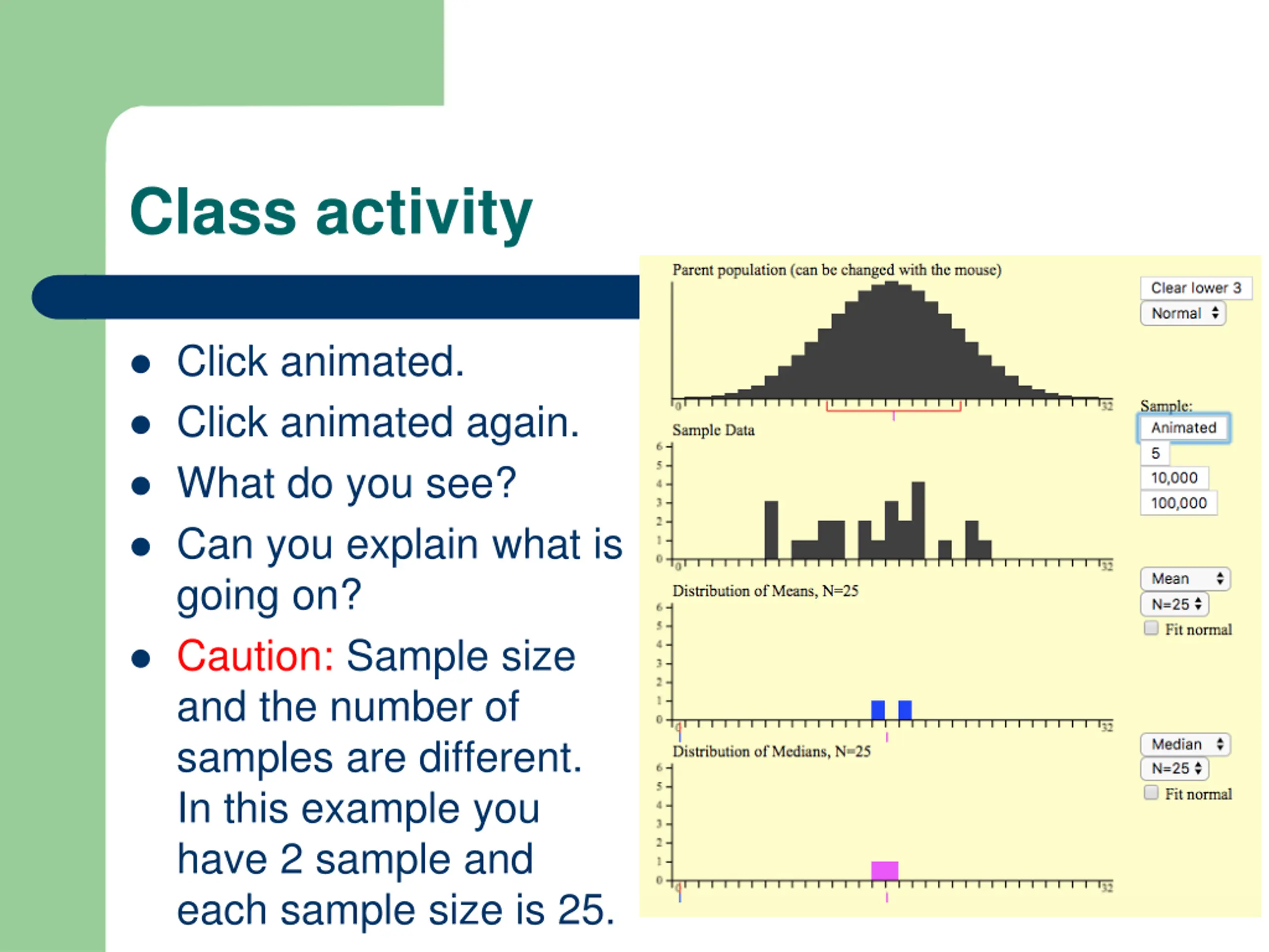 Class activity Click animated. Click animated again. What do you see? Can you explain what is going on? Caution: Sample size and the number of samples are different. In this example you have 2 sample and each sample size is 25.