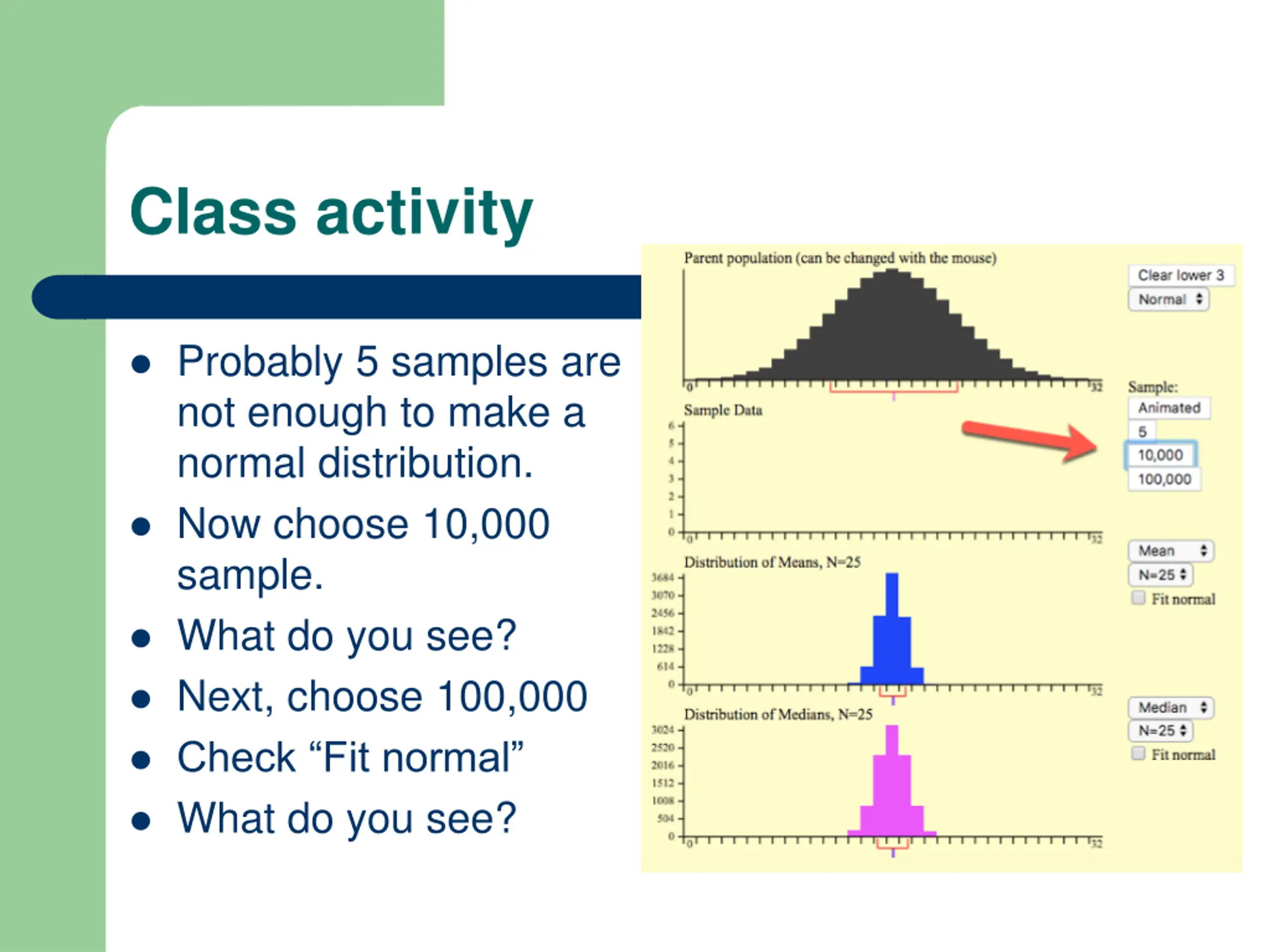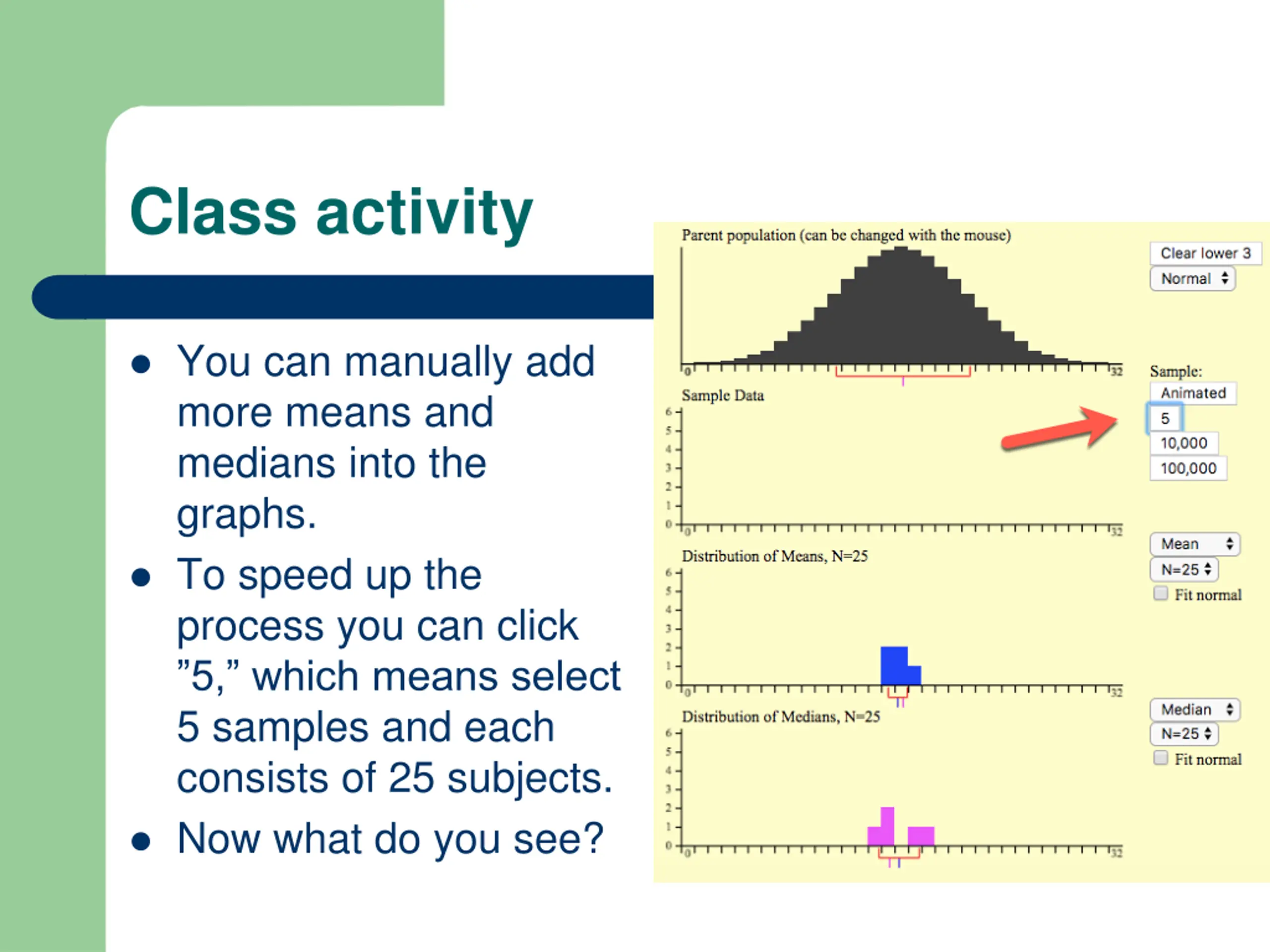 Class activity You can manually add more means and medians into the graphs. To speed up the process you can click 5, which means select 5 samples and each consists of 25 subjects. Now what do you see?