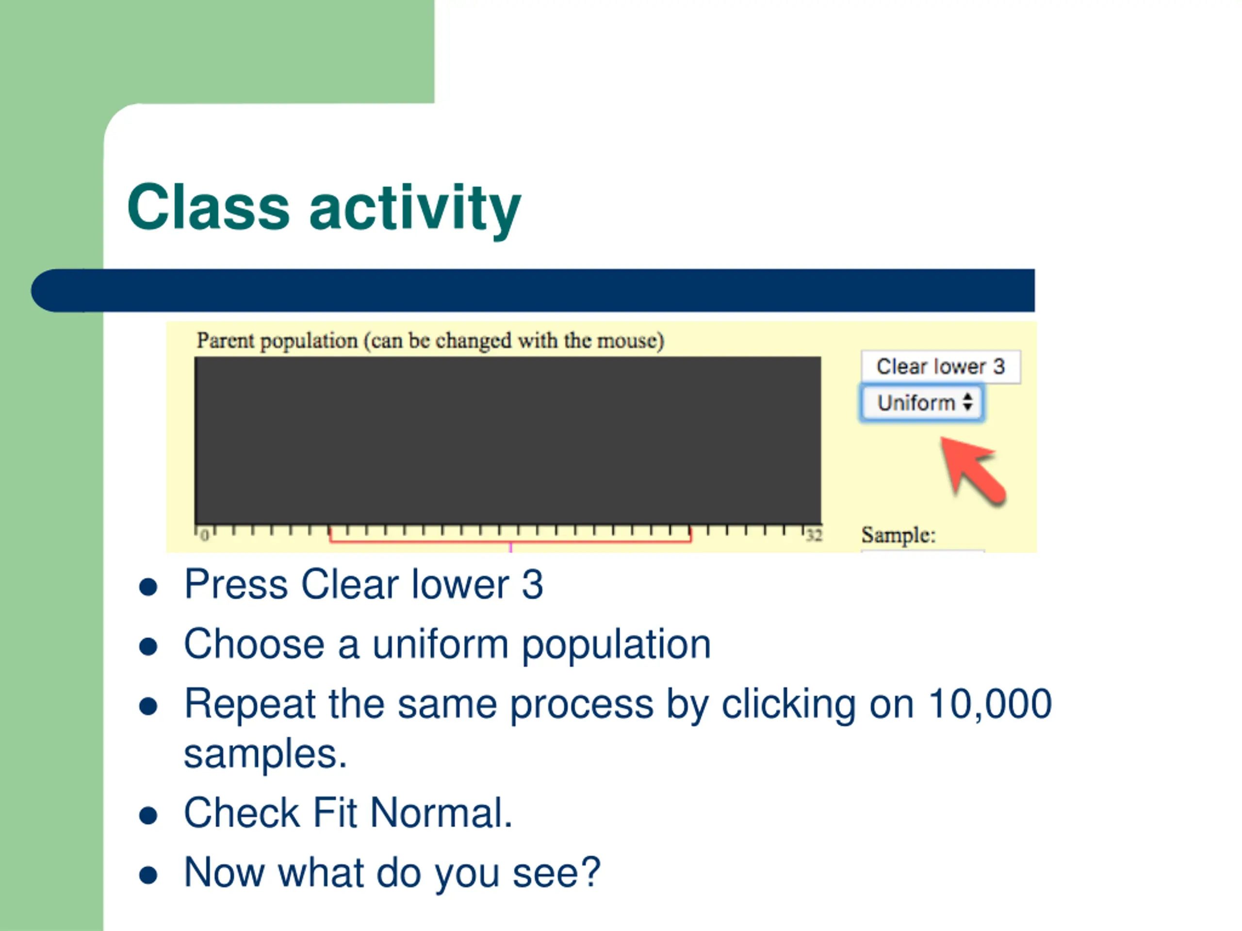 Class activity Press Clear lower 3 Choose a uniform population Repeat the same process by clicking on 10,000 samples. Check Fit Normal. Now what do you see?