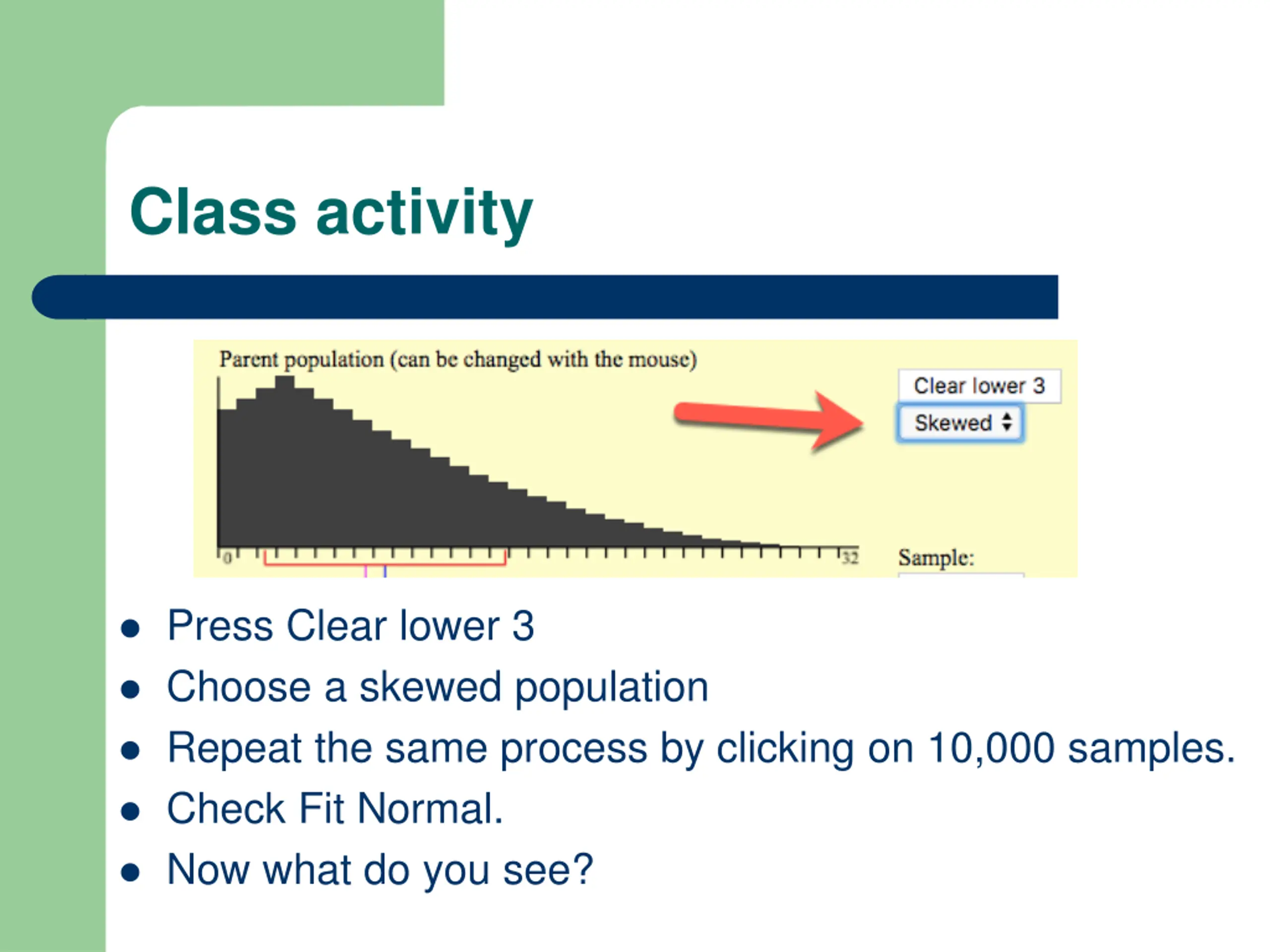Class activity Press Clear lower 3 Choose a skewed population Repeat the same process by clicking on 10,000 samples. Check Fit Normal. Now what do you see?
