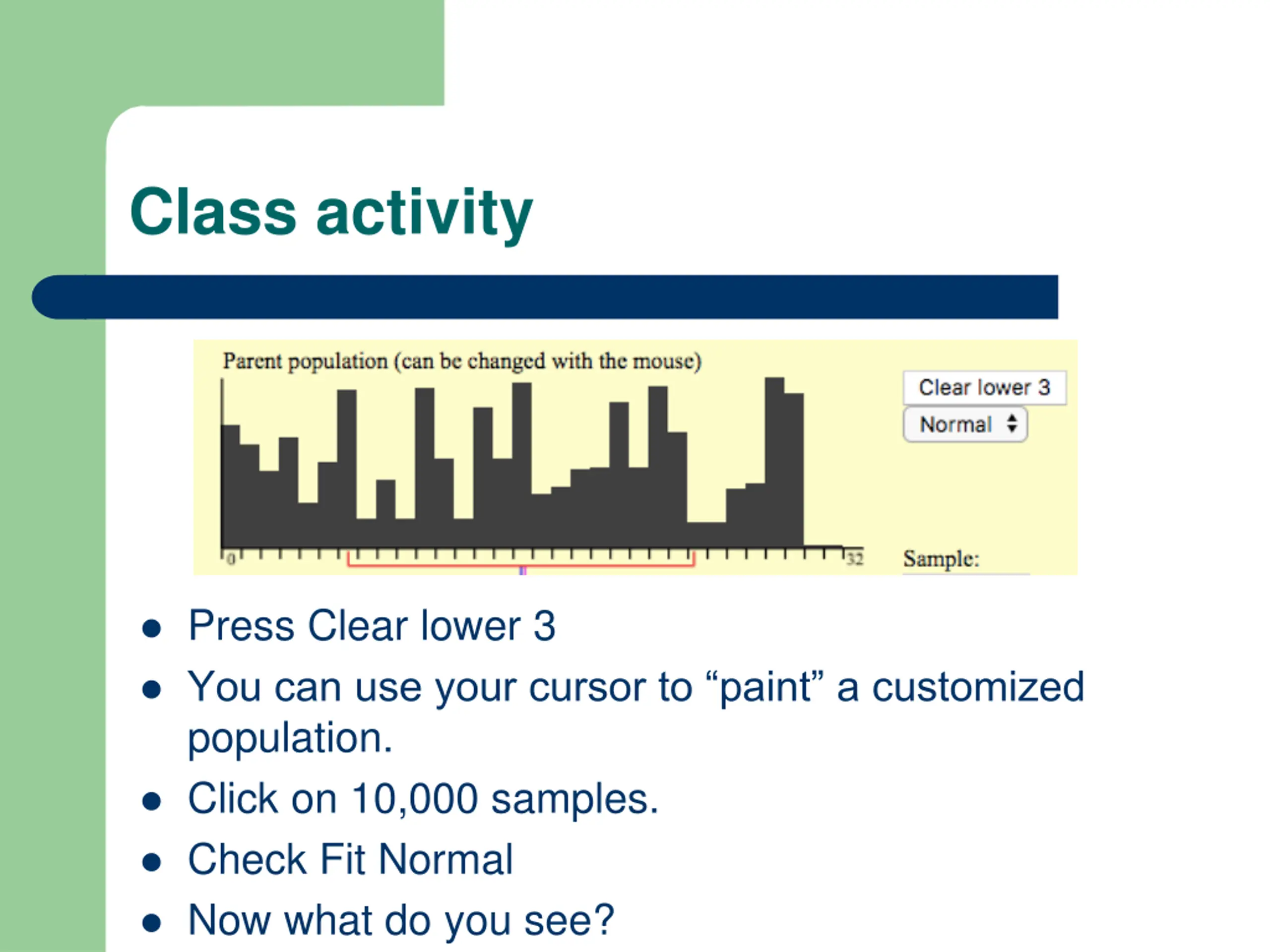 Class activity Press Clear lower 3 You can use your cursor to paint a customized population. Click on 10,000 samples. Check Fit Normal Now what do you see?