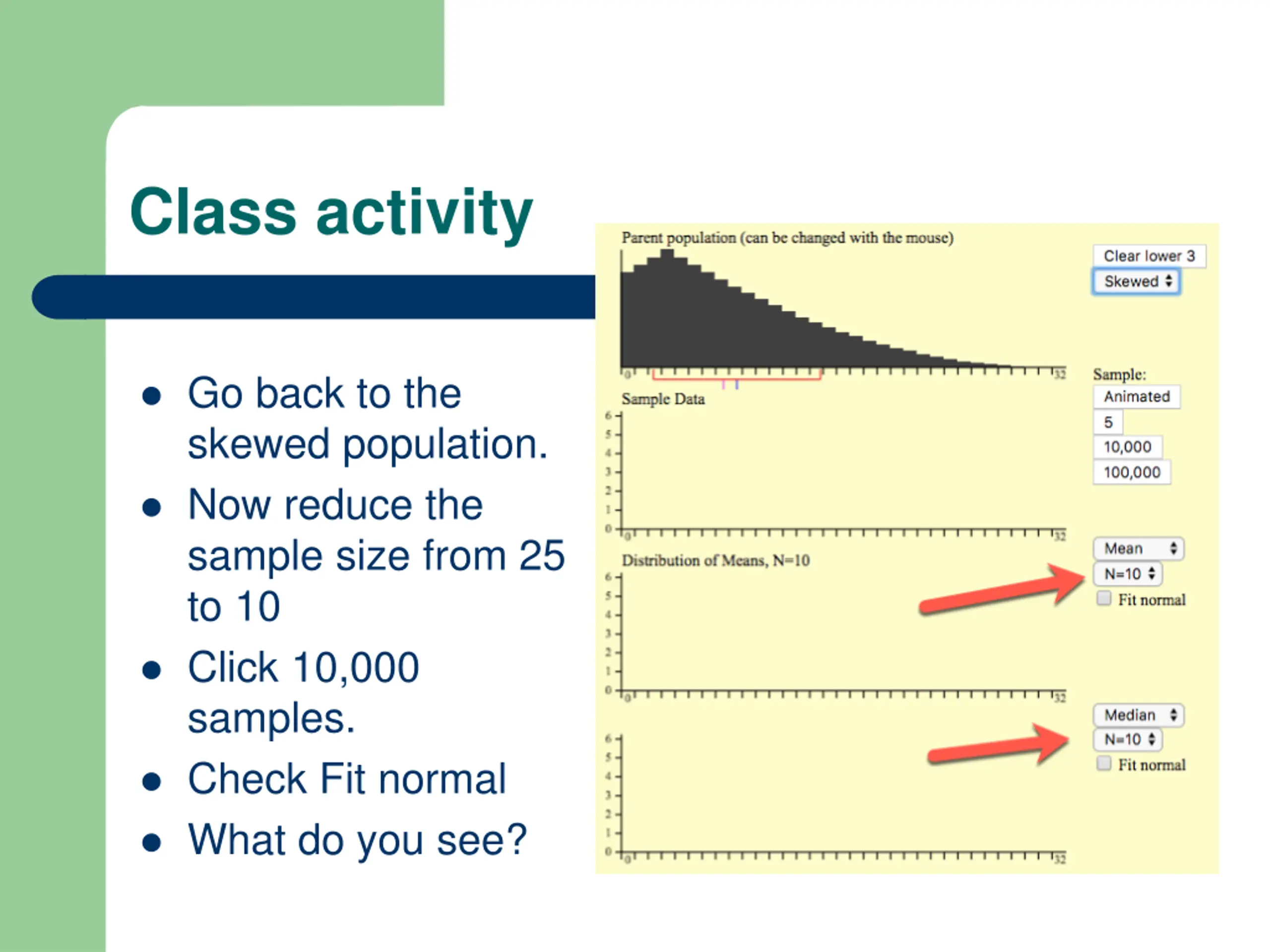 Class activity Go back to the skewed population. Now reduce the sample size from 25 to 10 Click 10,000 samples. Check Fit normal What do you see?