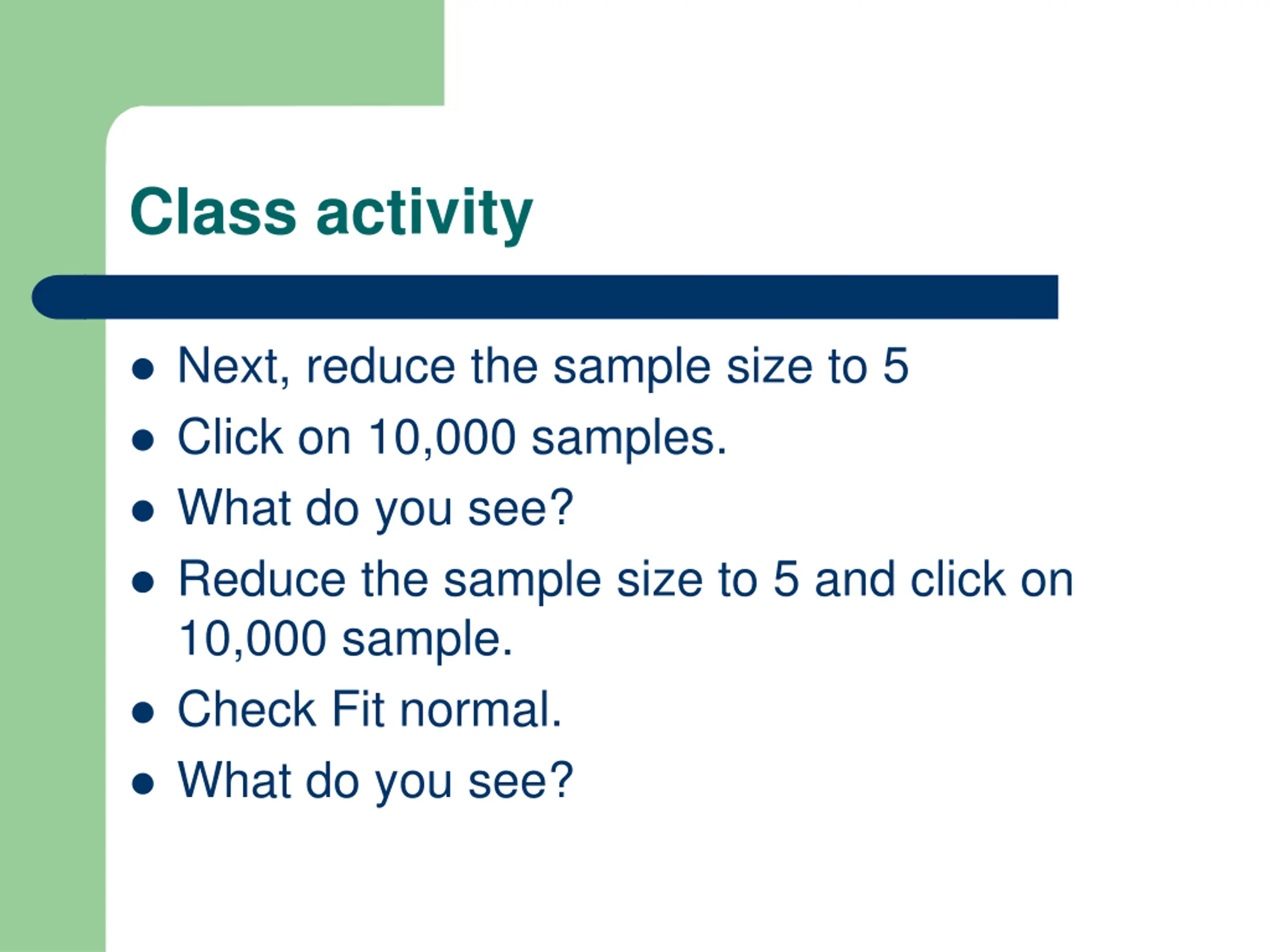 Class activity Next, reduce the sample size to 5 Click on 10,000 samples. What do you see? Reduce the sample size to 5 and click on 10,000 sample. Check Fit normal. What do you see?