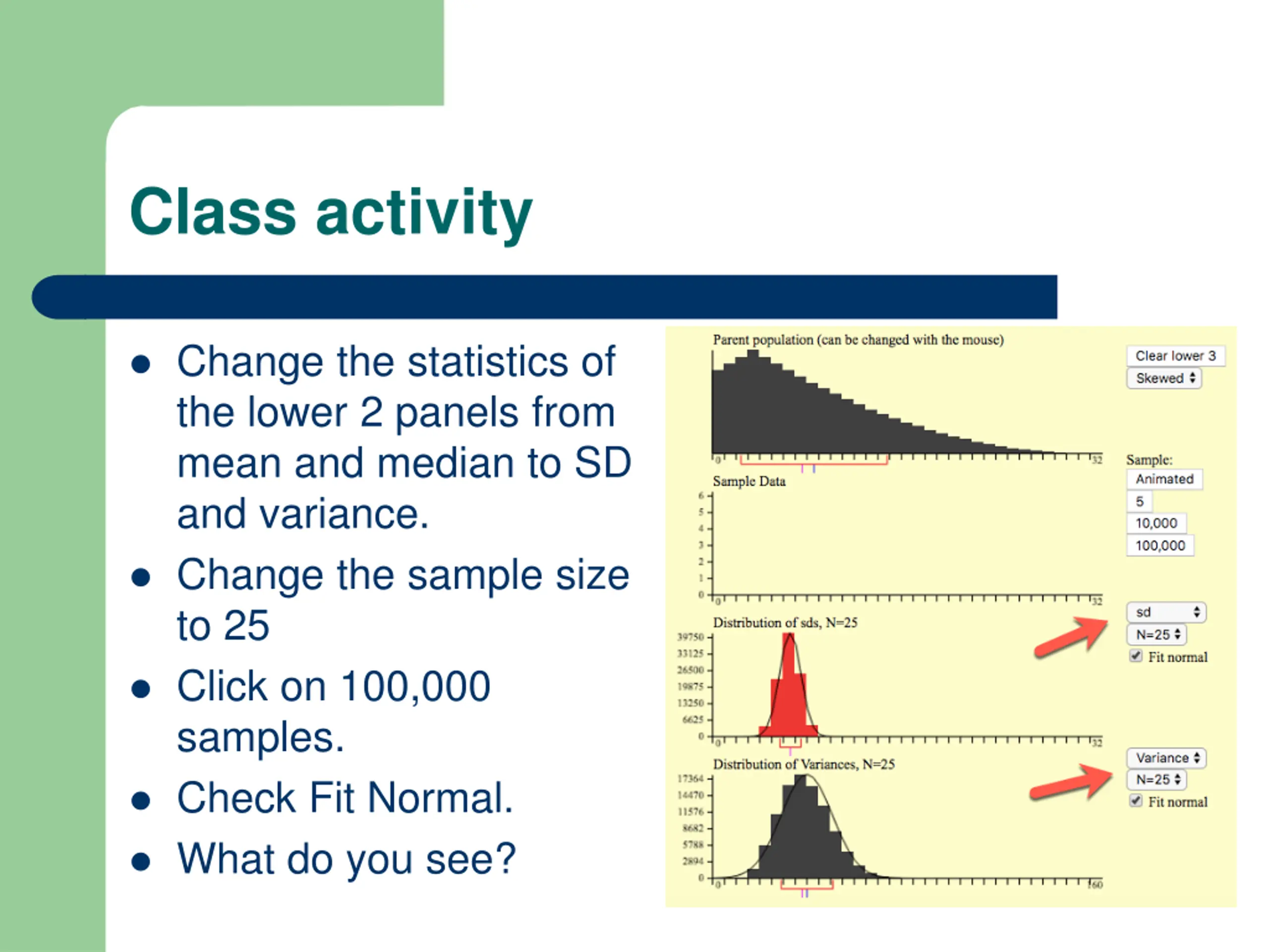 Class activity Change the statistics of the lower 2 panels from mean and median to SD and variance. Change the sample size to 25 Click on 100,000 samples. Check Fit Normal. What do you see?