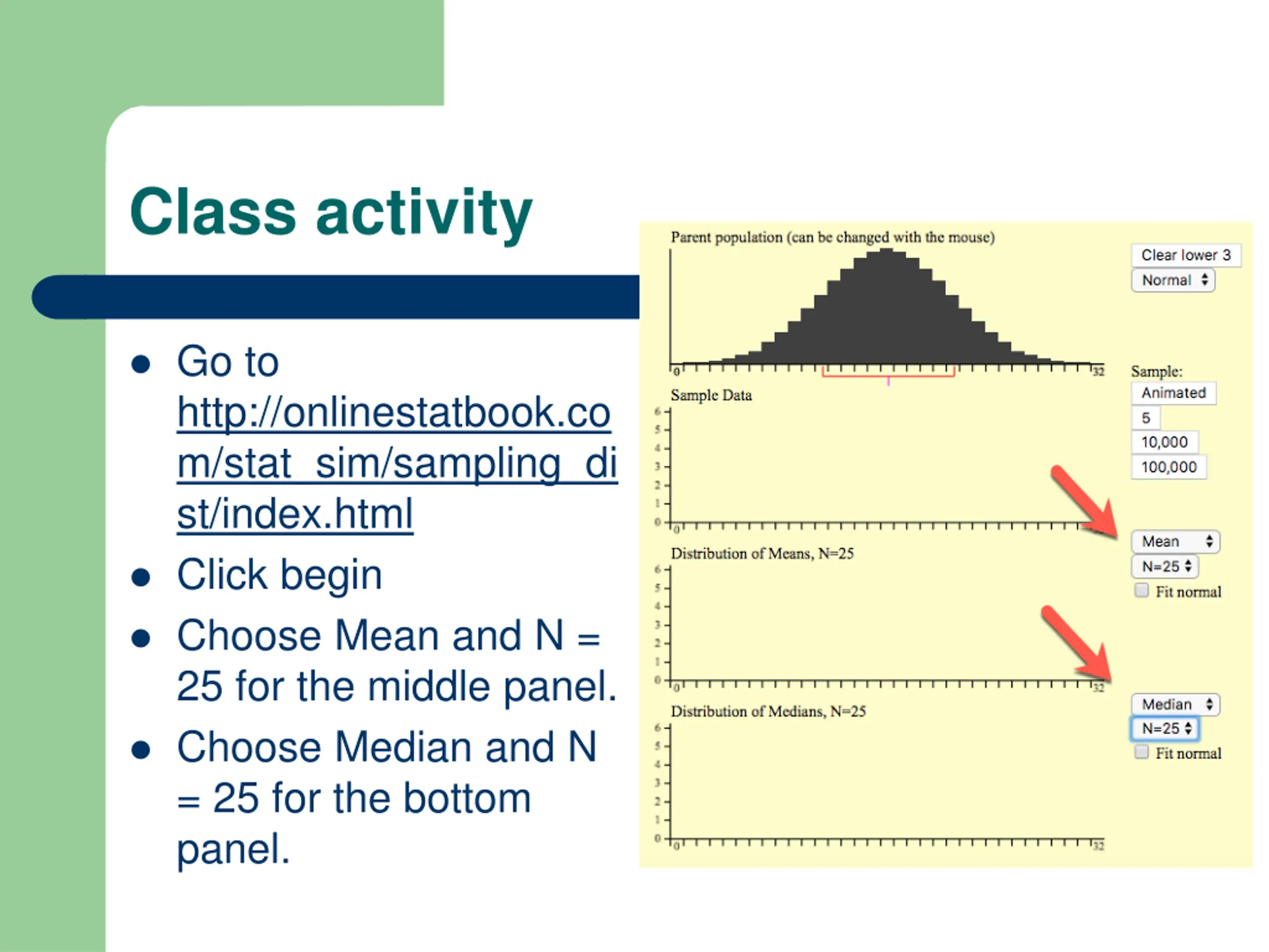 Class activity Go to http://onlinestatbook.co m/stat_sim/sampling_di st/index.html Click begin Choose Mean and N = 25 for the middle panel. Choose Median and N = 25 for the bottom panel.