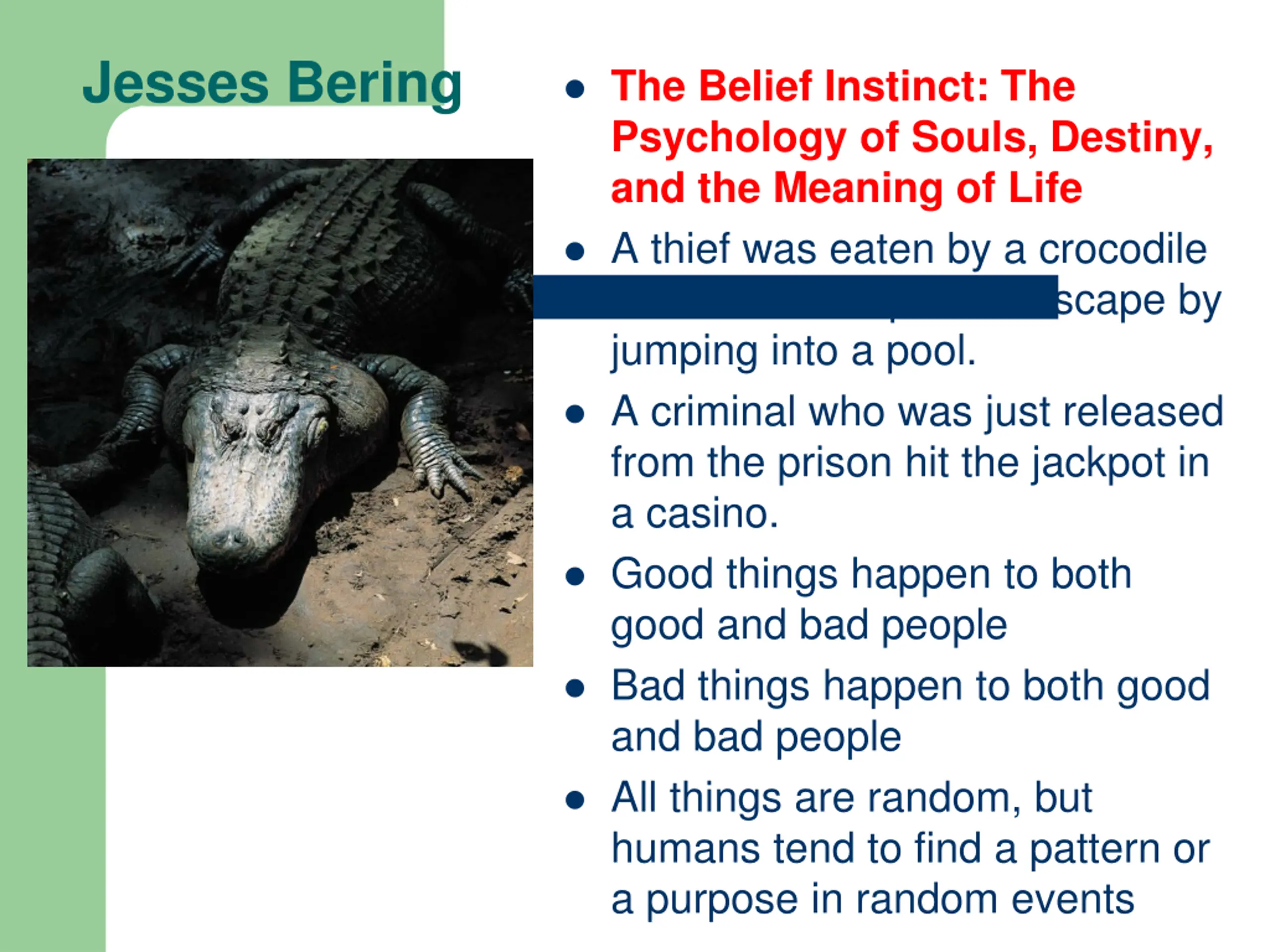 Jesses Bering The Belief Instinct: The Psychology of Souls, Destiny, and the Meaning of Life A thief was eaten by a crocodile when he attempted to escape by jumping into a pool. A criminal who was just released from the prison hit the jackpot in a casino. Good things happen to both good and bad people Bad things happen to both good and bad people All things are random, but humans tend to find a pattern or a purpose in random events
