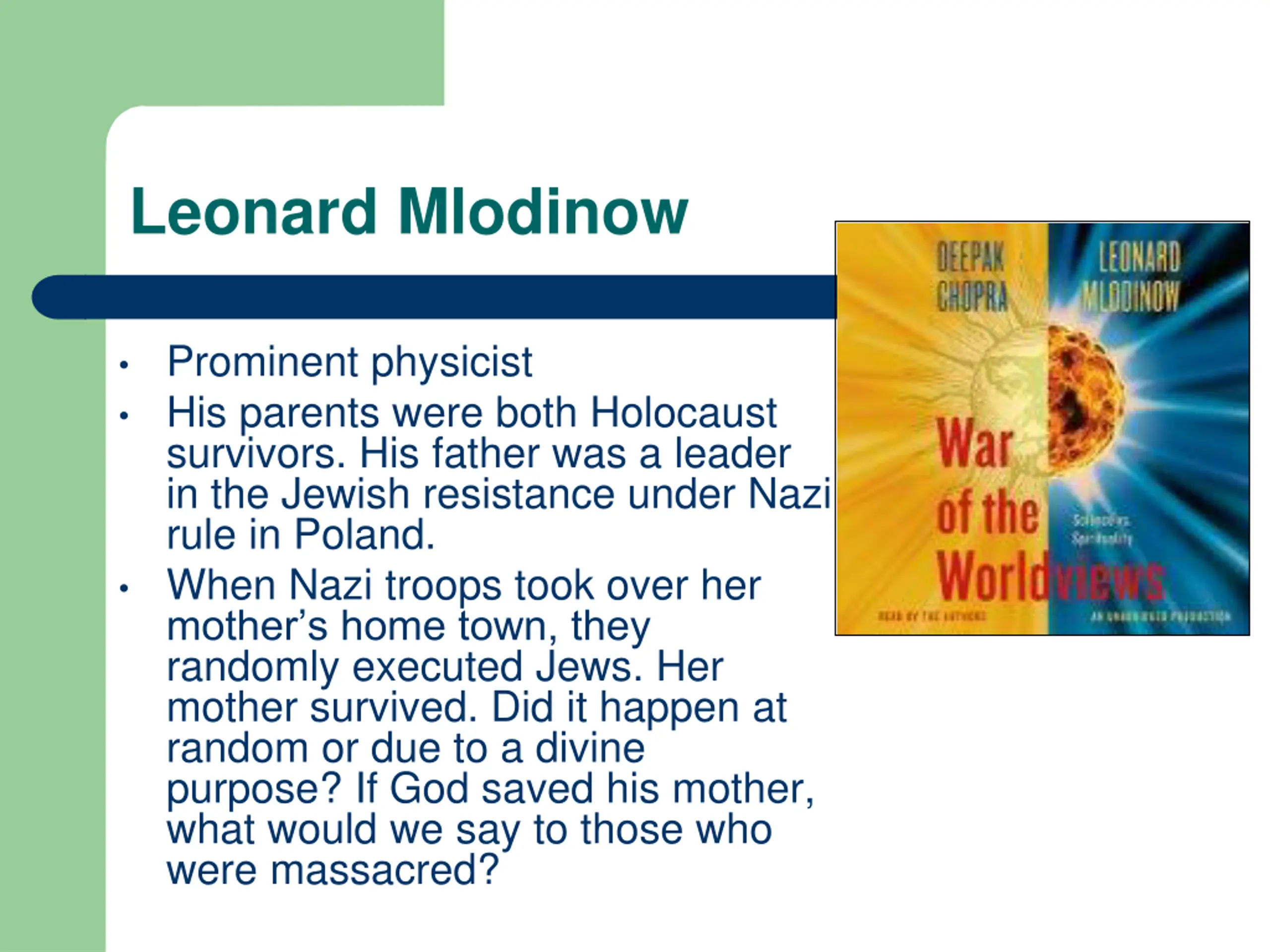 Leonard Mlodinow Prominent physicist His parents were both Holocaust survivors. His father was a leader in the Jewish resistance under Nazi rule in Poland. When Nazi troops took over her mother s home town, they randomly executed Jews. Her mother survived. Did it happen at random or due to a divine purpose? If God saved his mother, what would we say to those who were massacred?