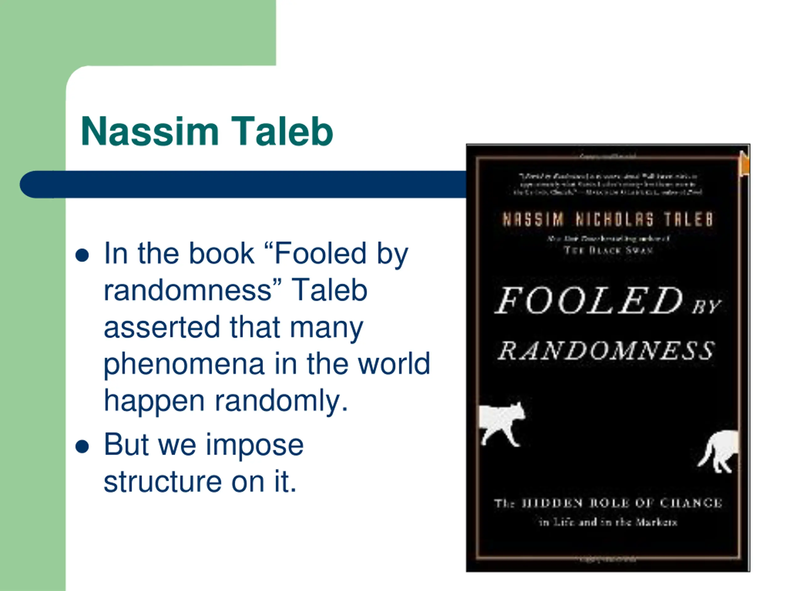 Nassim Taleb In the book Fooled by randomness Taleb asserted that many phenomena in the world happen randomly. But we impose structure on it.