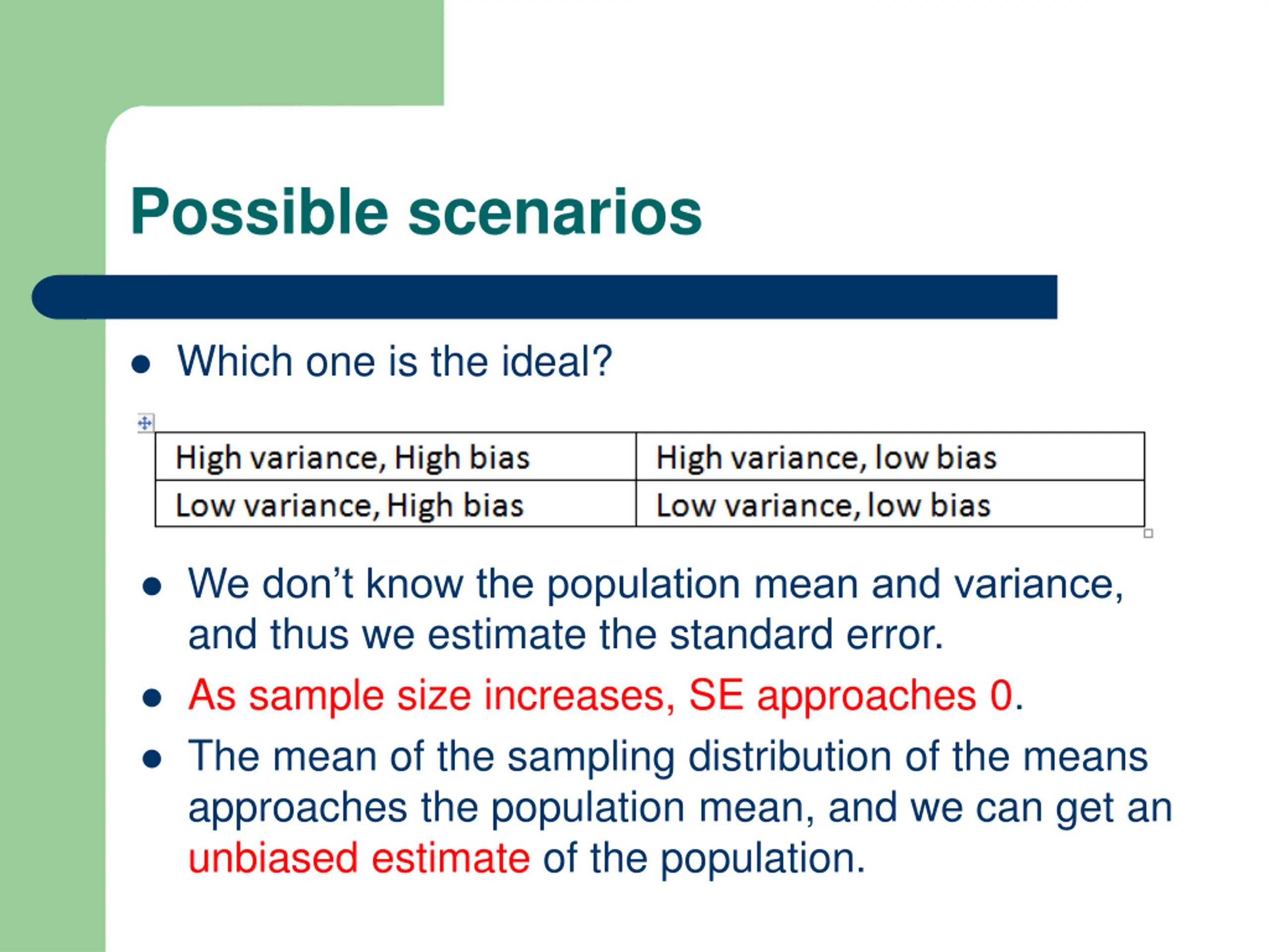 Possible scenarios Which one is the ideal? We don t know the population mean and variance, and thus we estimate the standard error. As sample size increases, SE approaches 0. The mean of the sampling distribution of the means approaches the population mean, and we can get an unbiased estimate of the population.
