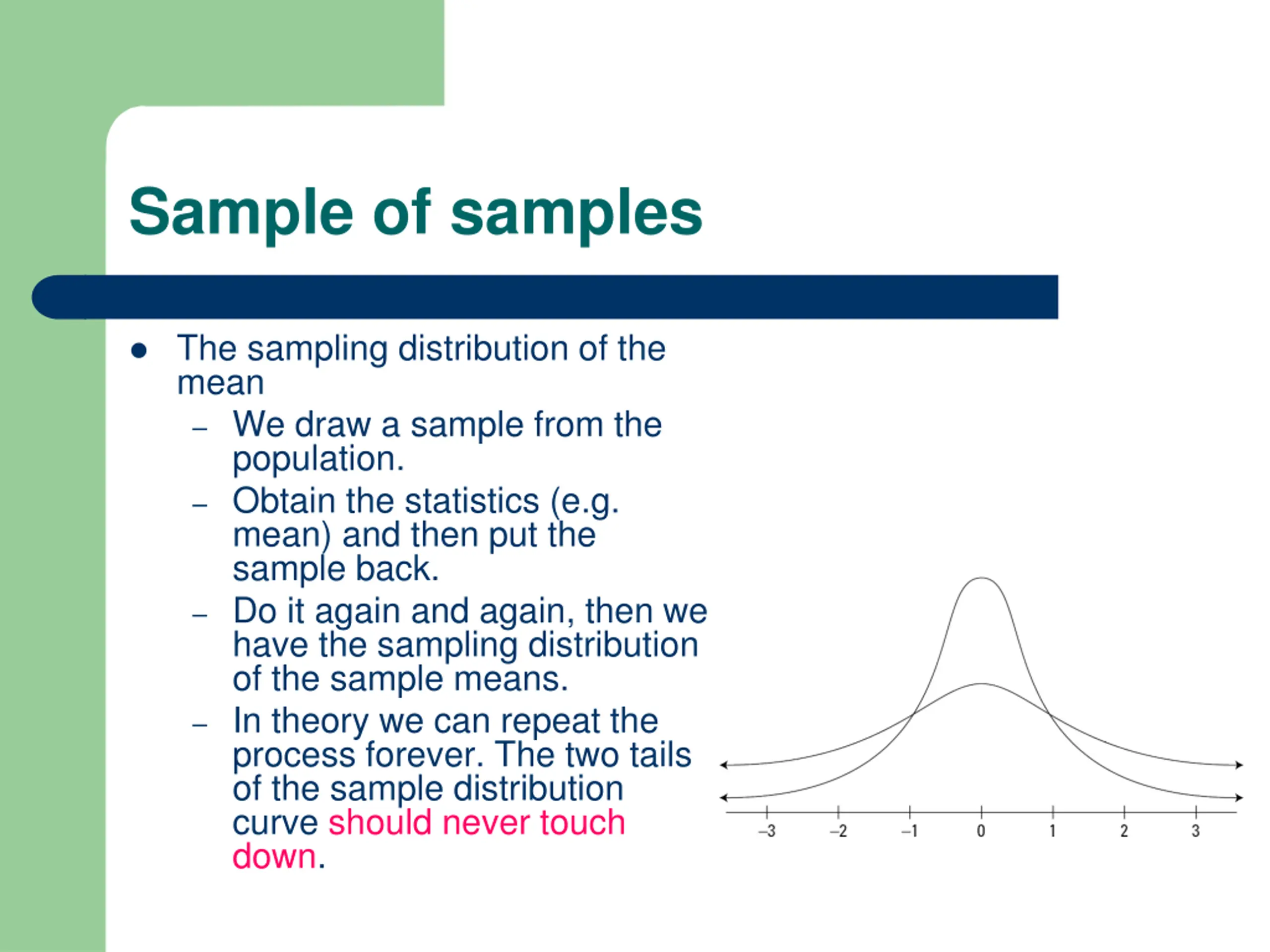 Sample of samples The sampling distribution of the mean We draw a sample from the population. Obtain the statistics (e.g. mean) and then put the sample back. Do it again and again, then we have the sampling distribution of the sample means. In theory we can repeat the process forever. The two tails of the sample distribution curve should never touch down.