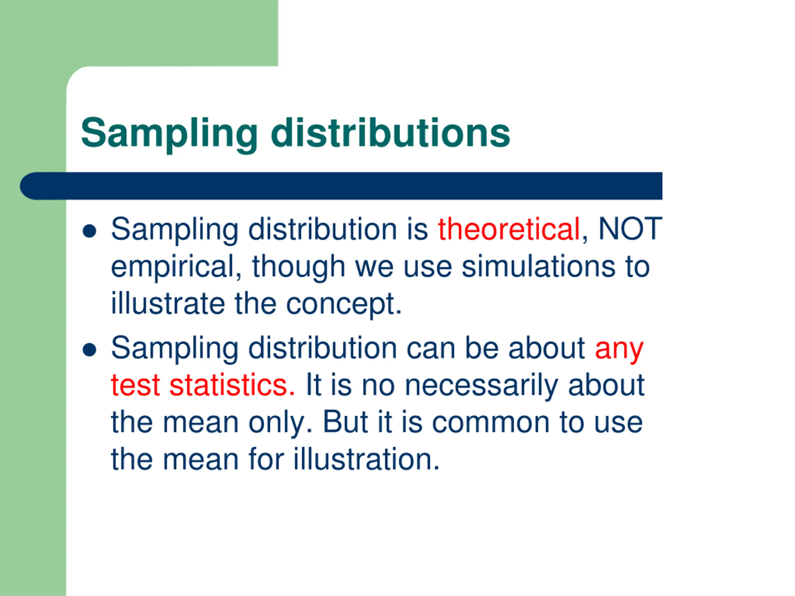 Sampling distributions Sampling distribution is theoretical, NOT empirical, though we use simulations to illustrate the concept. Sampling distribution can be about any test statistics. It is no necessarily about the mean only. But it is common to use the mean for illustration.