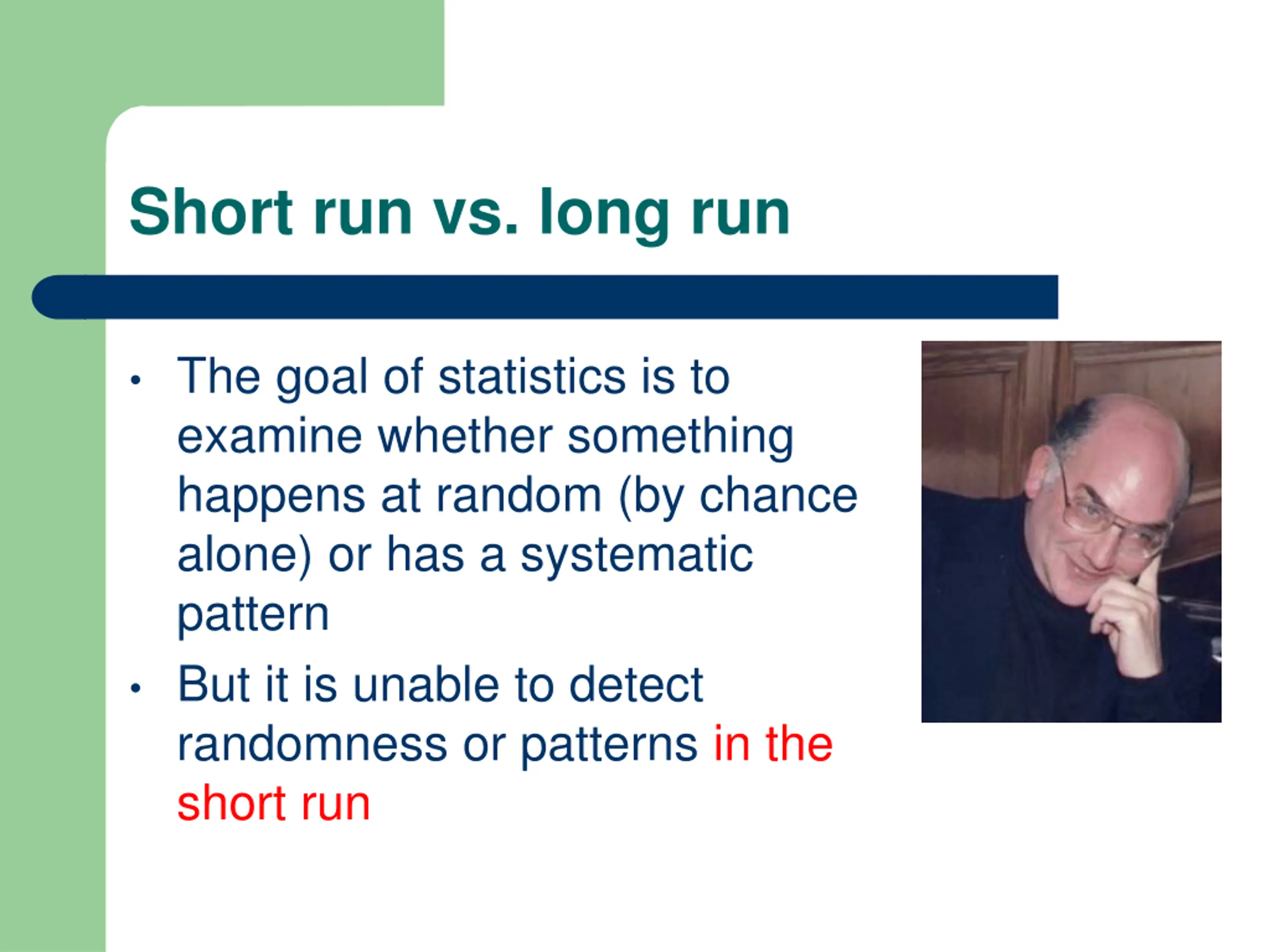 Short run vs. long run The goal of statistics is to examine whether something happens at random (by chance alone) or has a systematic pattern But it is unable to detect randomness or patterns in the short run