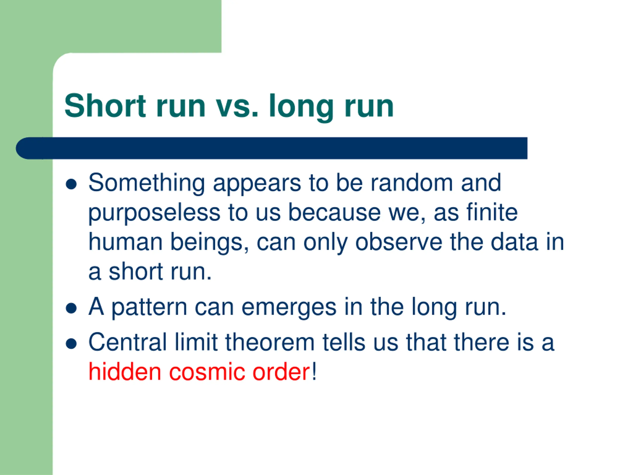Short run vs. long run Something appears to be random and purposeless to us because we, as finite human beings, can only observe the data in a short run. A pattern can emerges in the long run. Central limit theorem tells us that there is a hidden cosmic order!