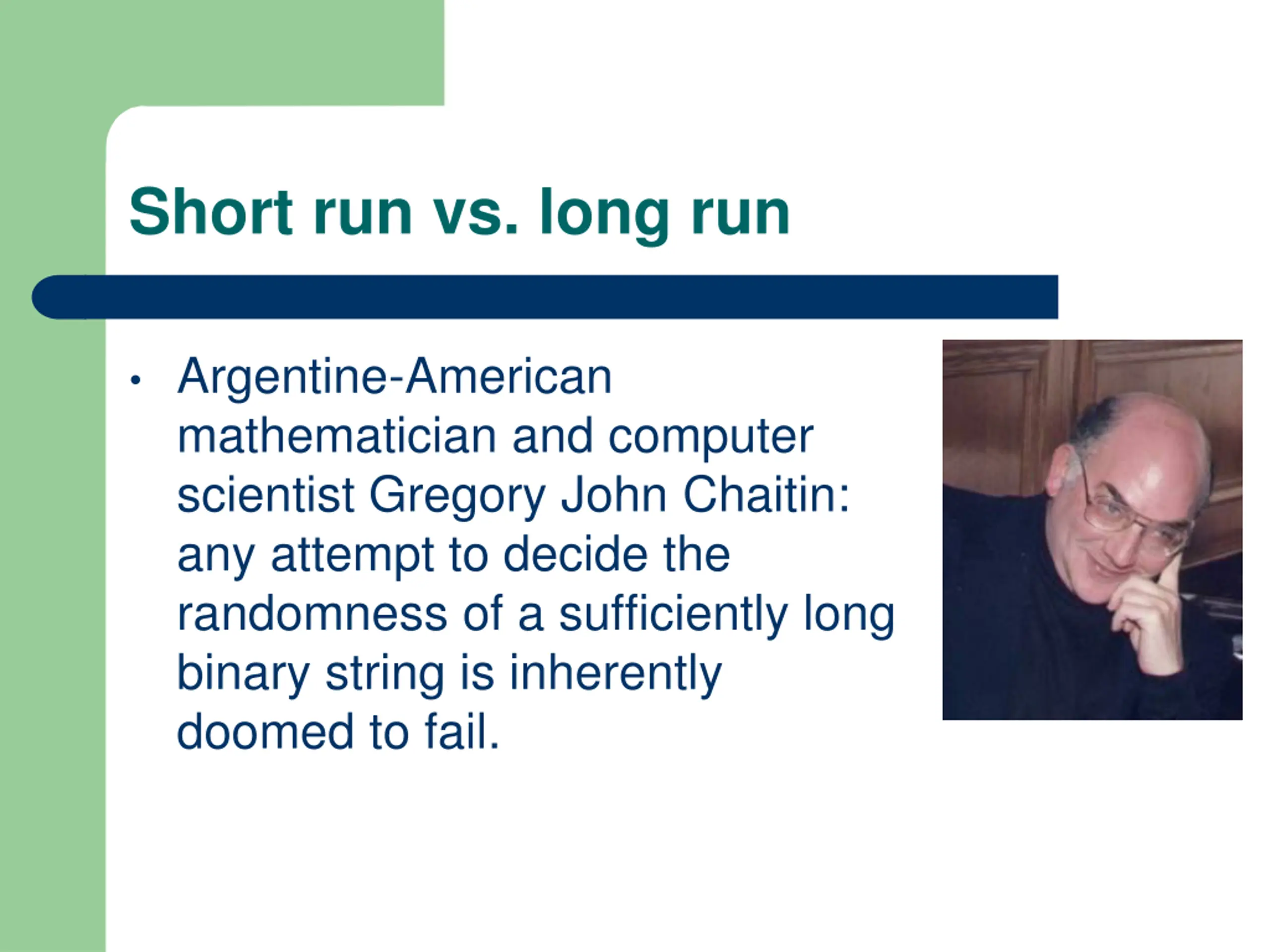 Short run vs. long run Argentine-American mathematician and computer scientist Gregory John Chaitin: any attempt to decide the randomness of a sufficiently long binary string is inherently doomed to fail.