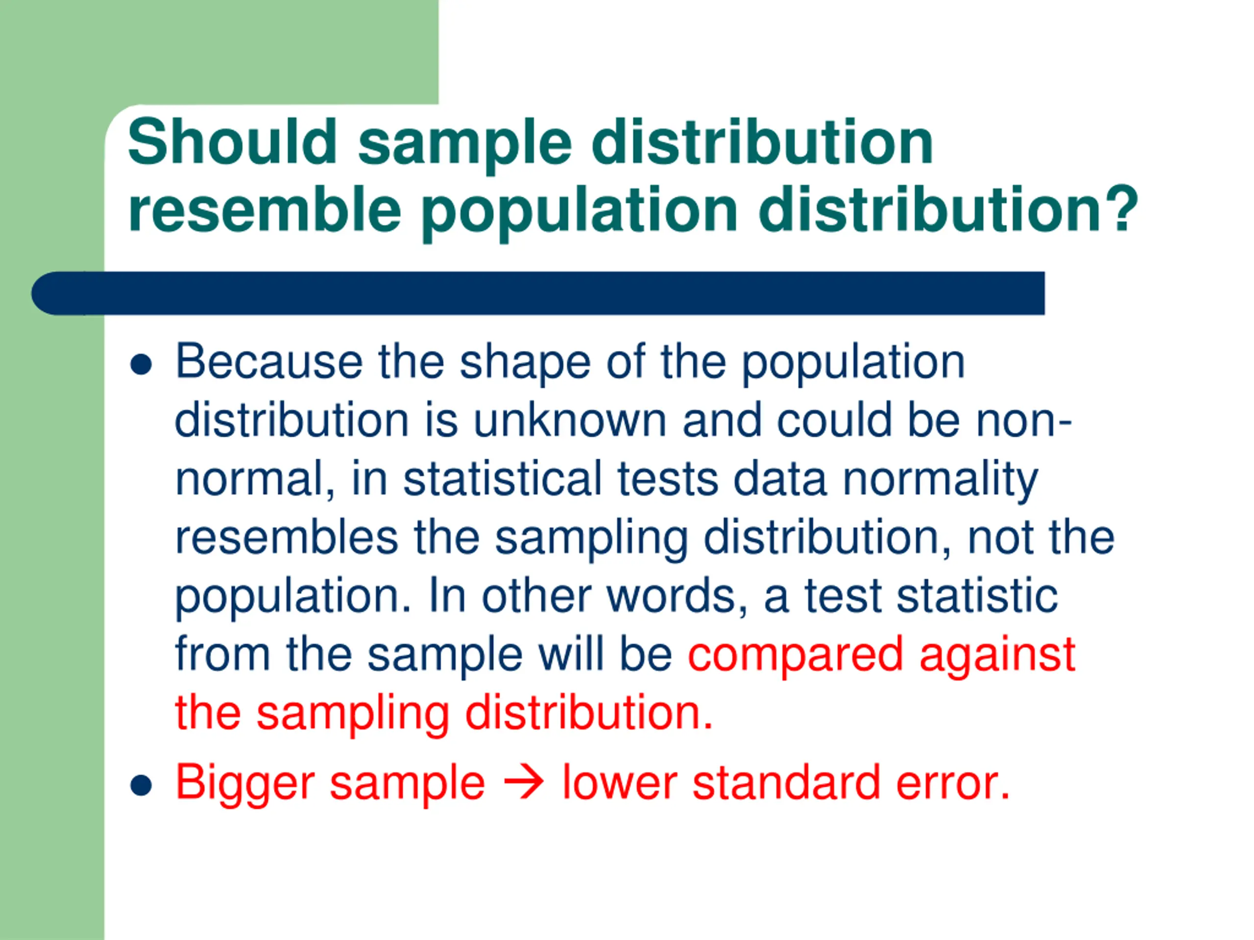 Should sample distribution resemble population distribution? Because the shape of the population distribution is unknown and could be non- normal, in statistical tests data normality resembles the sampling distribution, not the population. In other words, a test statistic from the sample will be compared against the sampling distribution. Bigger sample lower standard error.