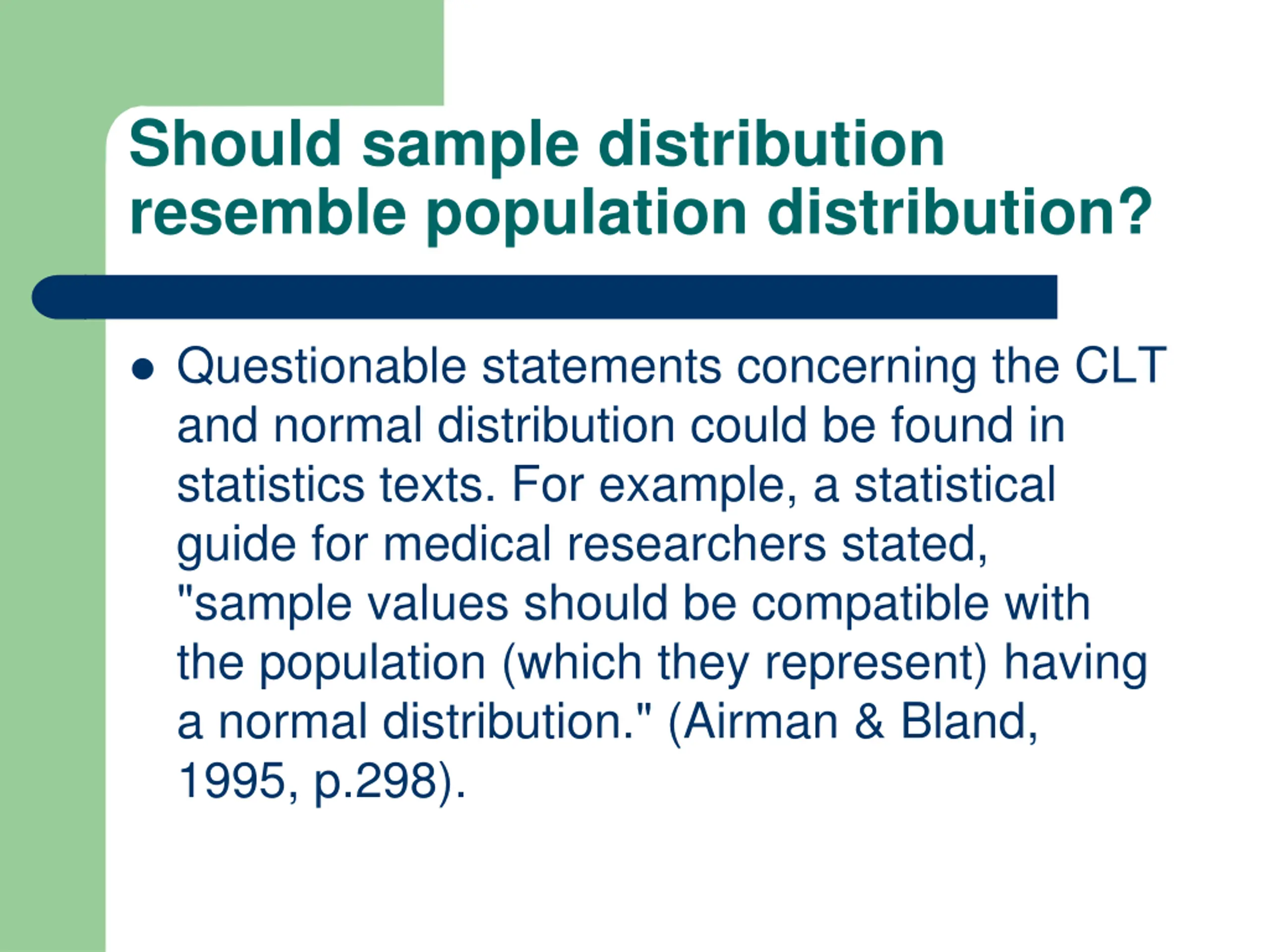 Should sample distribution resemble population distribution? Questionable statements concerning the CLT and normal distribution could be found in statistics texts. For example, a statistical guide for medical researchers stated, "sample values should be compatible with the population (which they represent) having a normal distribution." (Airman & Bland, 1995, p.298).