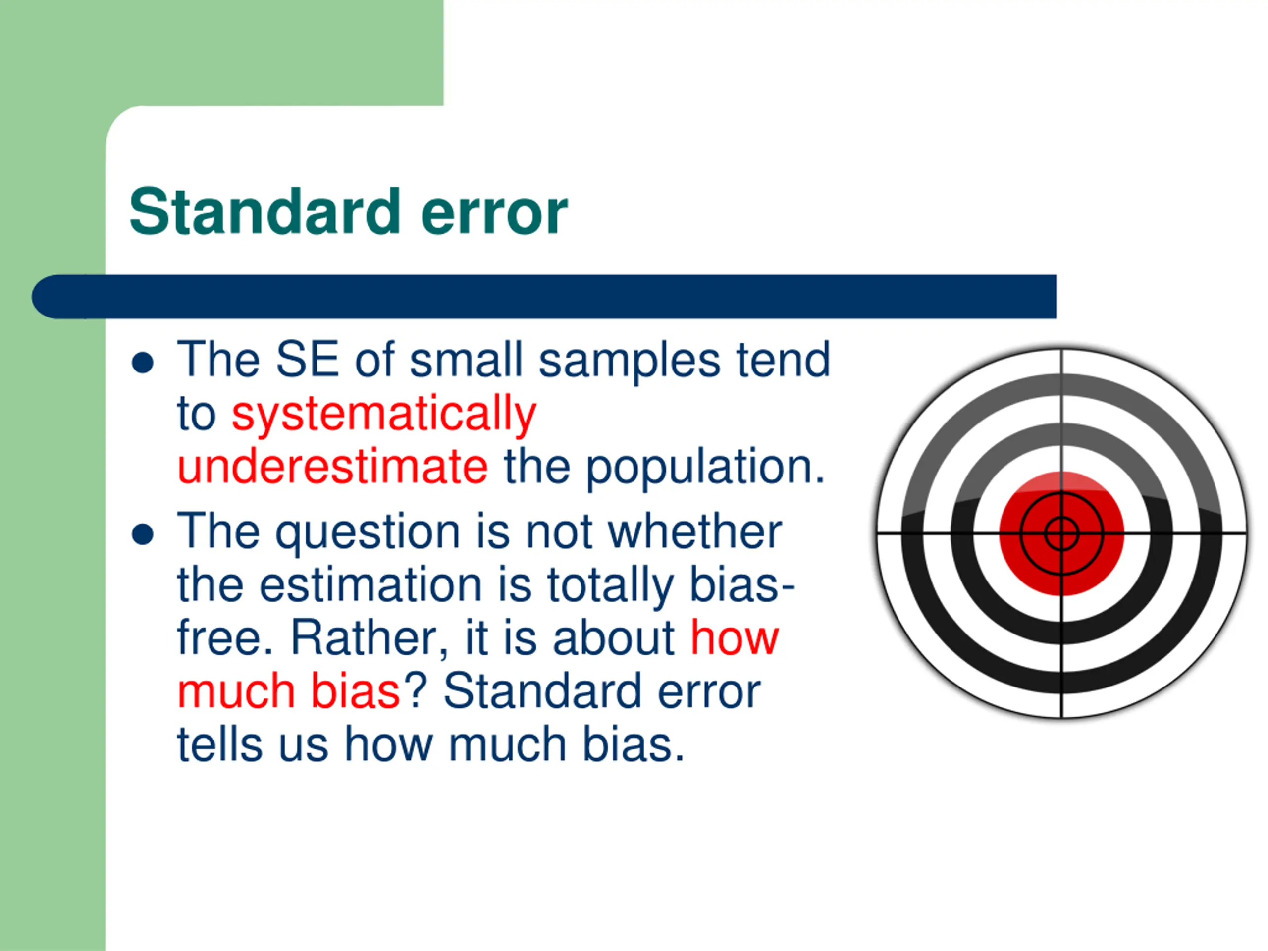 Standard error The SE of small samples tend to systematically underestimate the population. The question is not whether the estimation is totally bias- free. Rather, it is about how much bias? Standard error tells us how much bias.