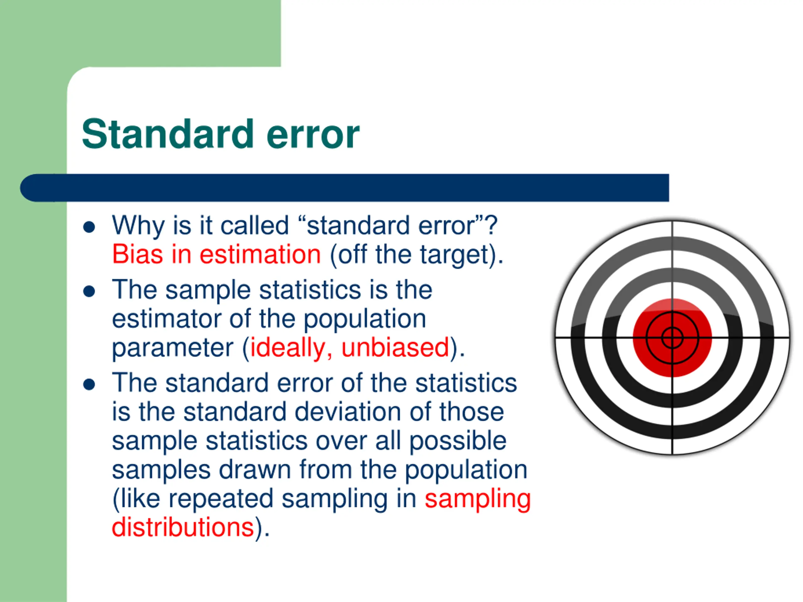 Standard error Why is it called standard error ? Bias in estimation (off the target). The sample statistics is the estimator of the population parameter (ideally, unbiased). The standard error of the statistics is the standard deviation of those sample statistics over all possible samples drawn from the population (like repeated sampling in sampling distributions).
