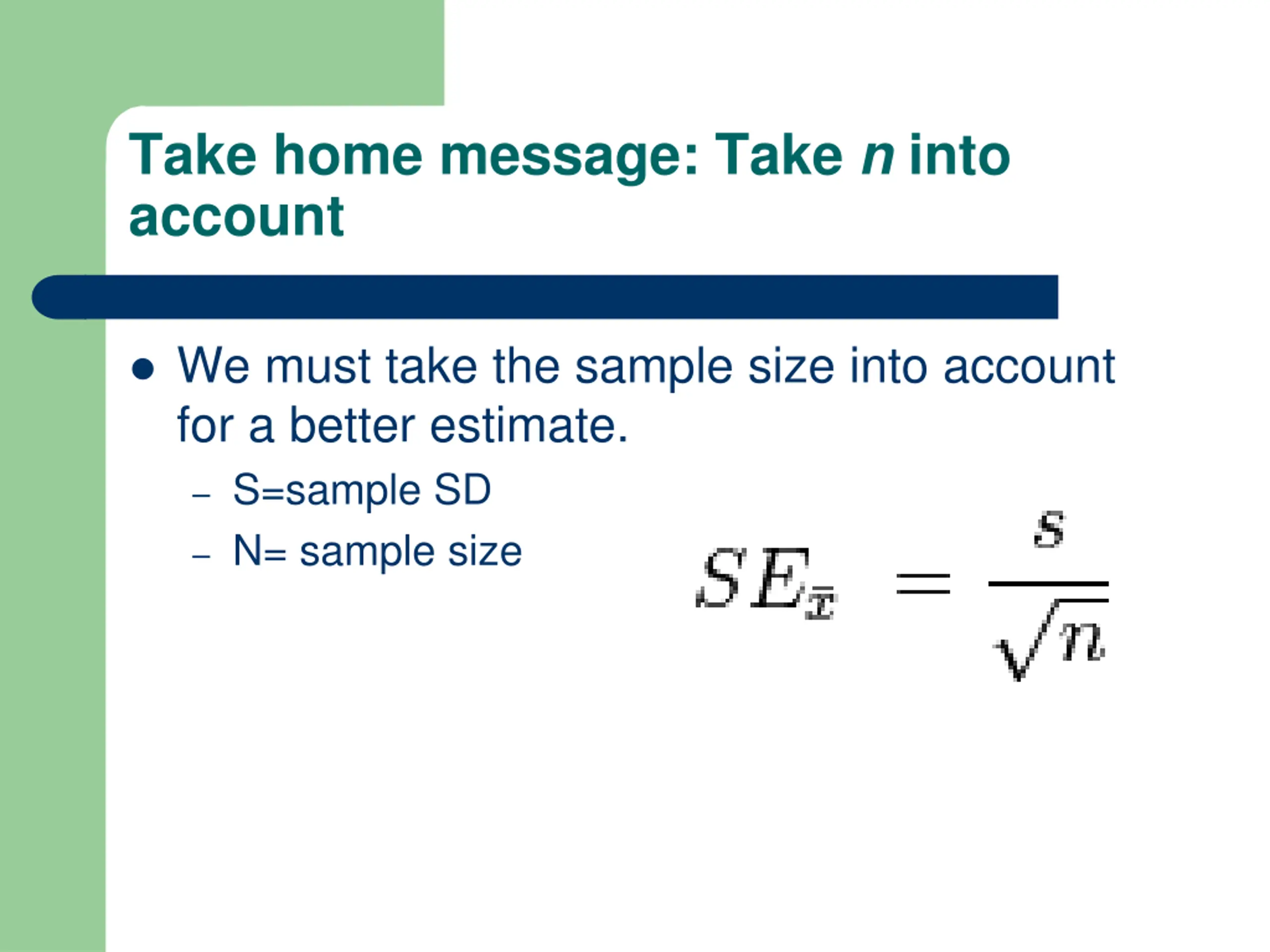 Take home message: Take n into account We must take the sample size into account for a better estimate. S=sample SD N= sample size