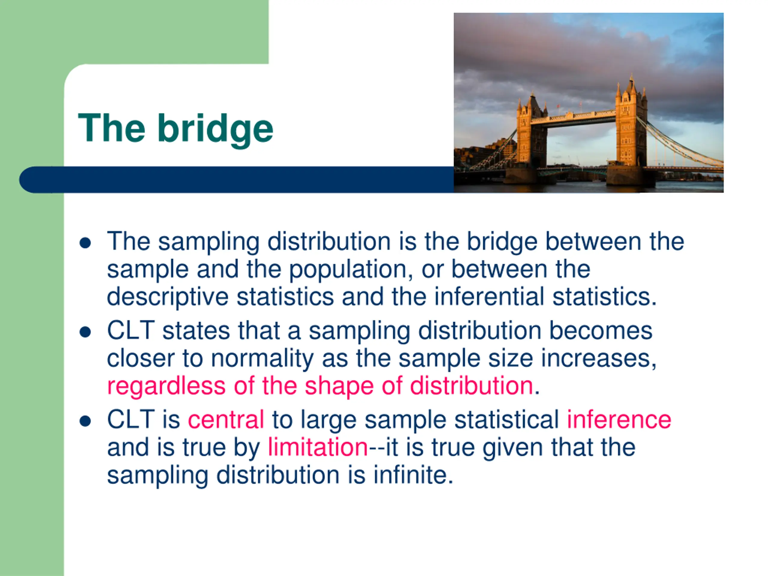 The bridge The sampling distribution is the bridge between the sample and the population, or between the descriptive statistics and the inferential statistics. CLT states that a sampling distribution becomes closer to normality as the sample size increases, regardless of the shape of distribution. CLT is central to large sample statistical inference and is true by limitation--it is true given that the sampling distribution is infinite.