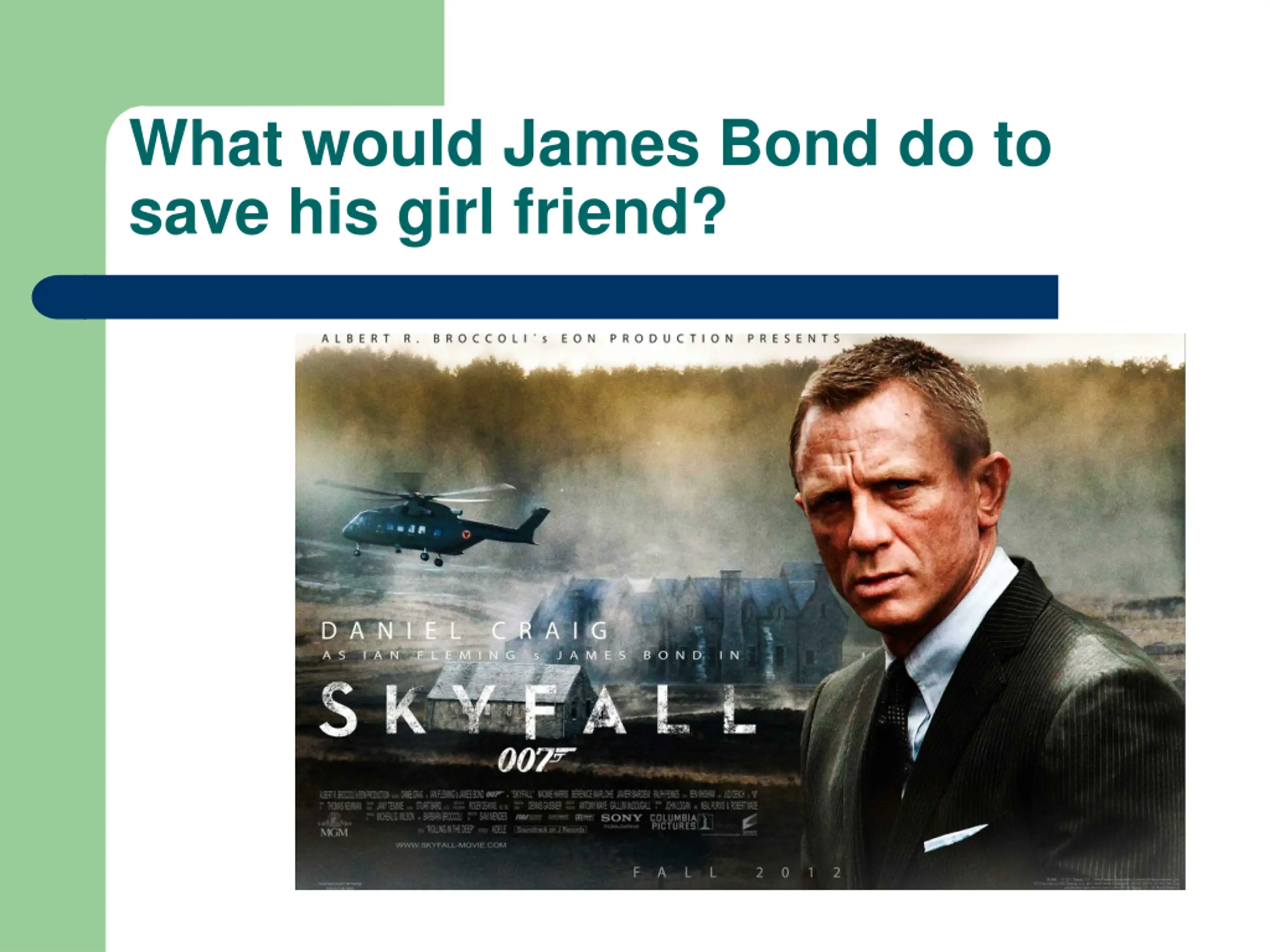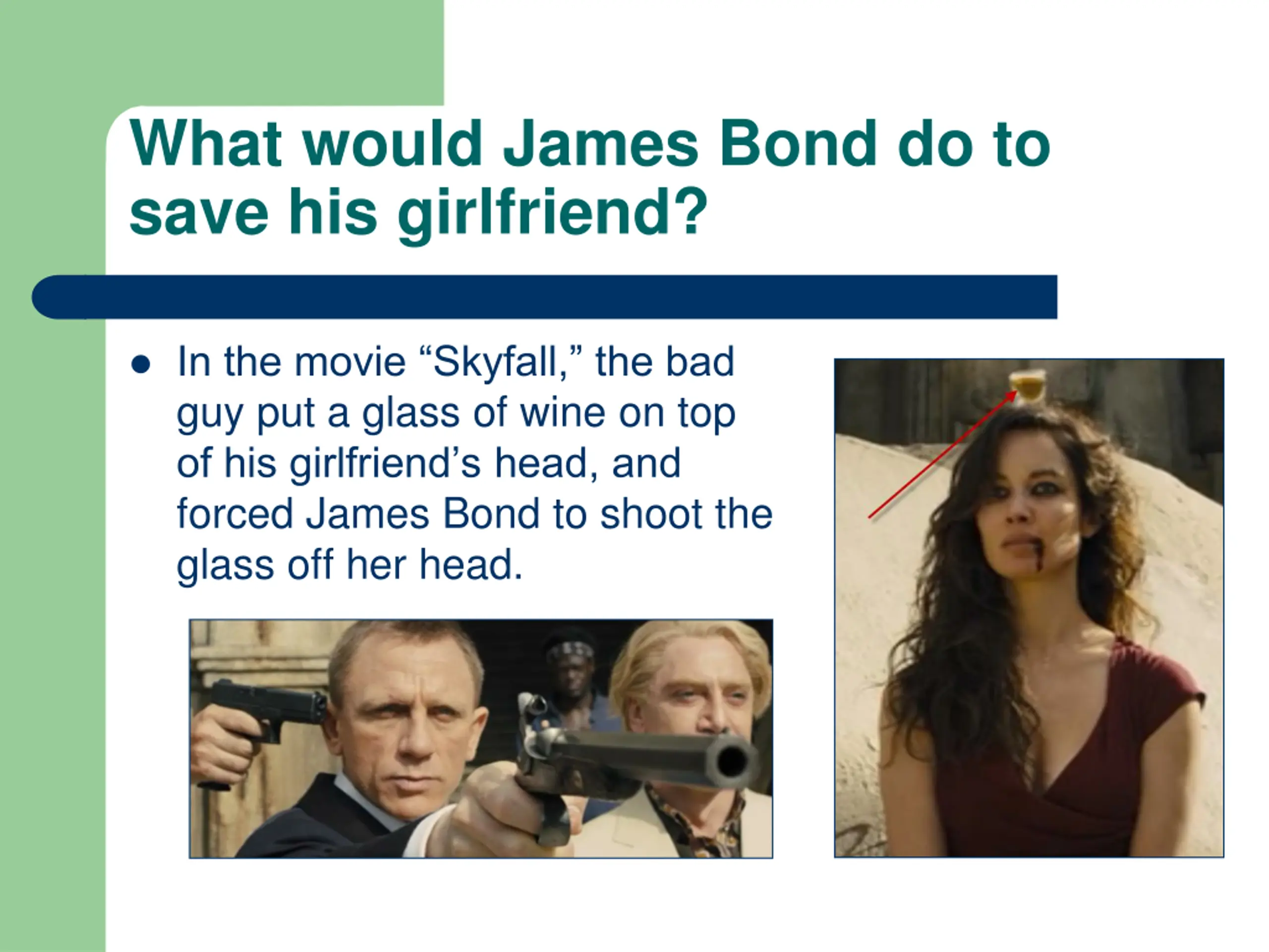 What would James Bond do to save his girlfriend? In the movie Skyfall, the bad guy put a glass of wine on top of his girlfriend s head, and forced James Bond to shoot the glass off her head.