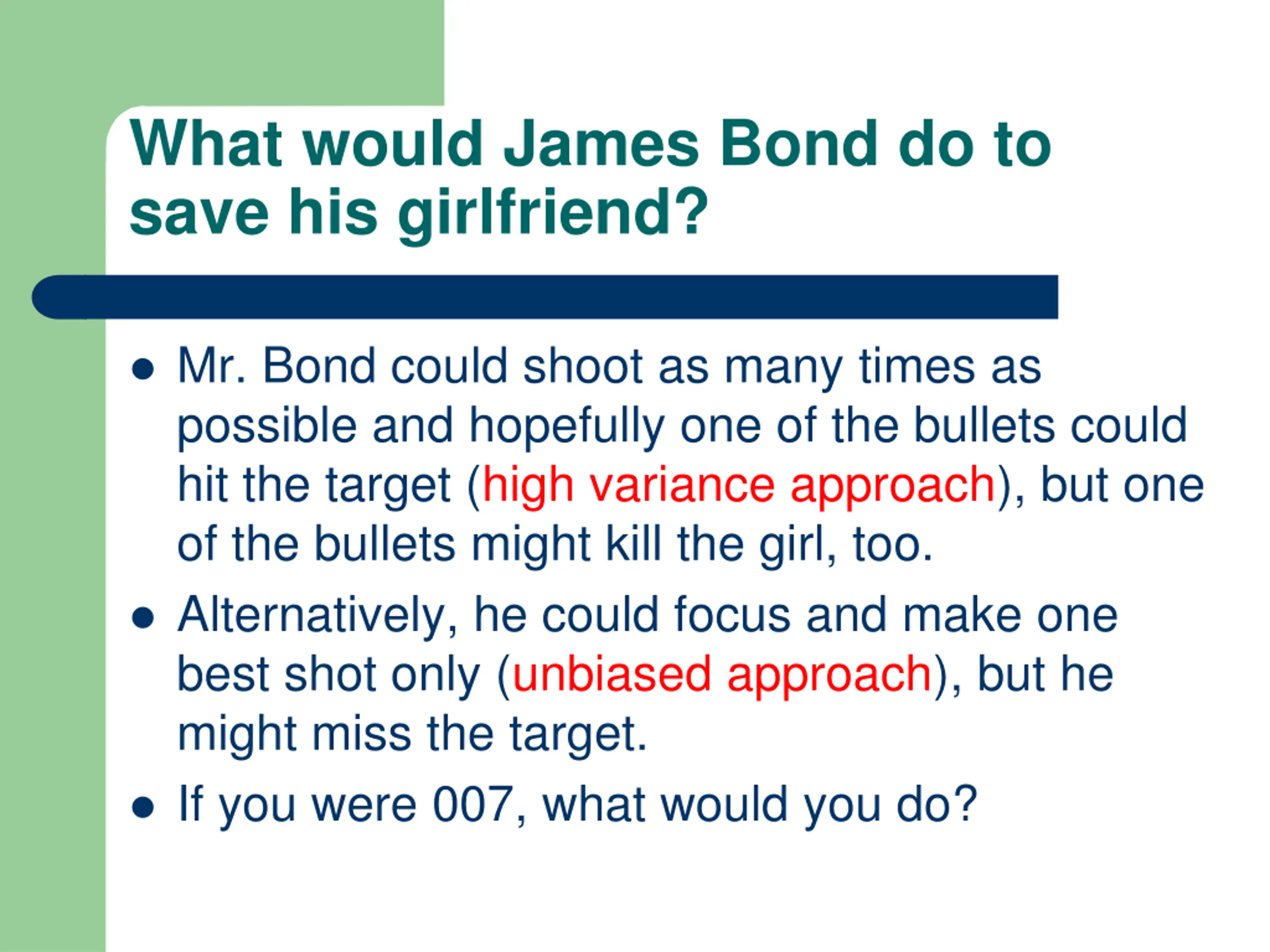 What would James Bond do to save his girlfriend? Mr. Bond could shoot as many times as possible and hopefully one of the bullets could hit the target (high variance approach), but one of the bullets might kill the girl, too. Alternatively, he could focus and make one best shot only (unbiased approach), but he might miss the target. If you were 007, what would you do?