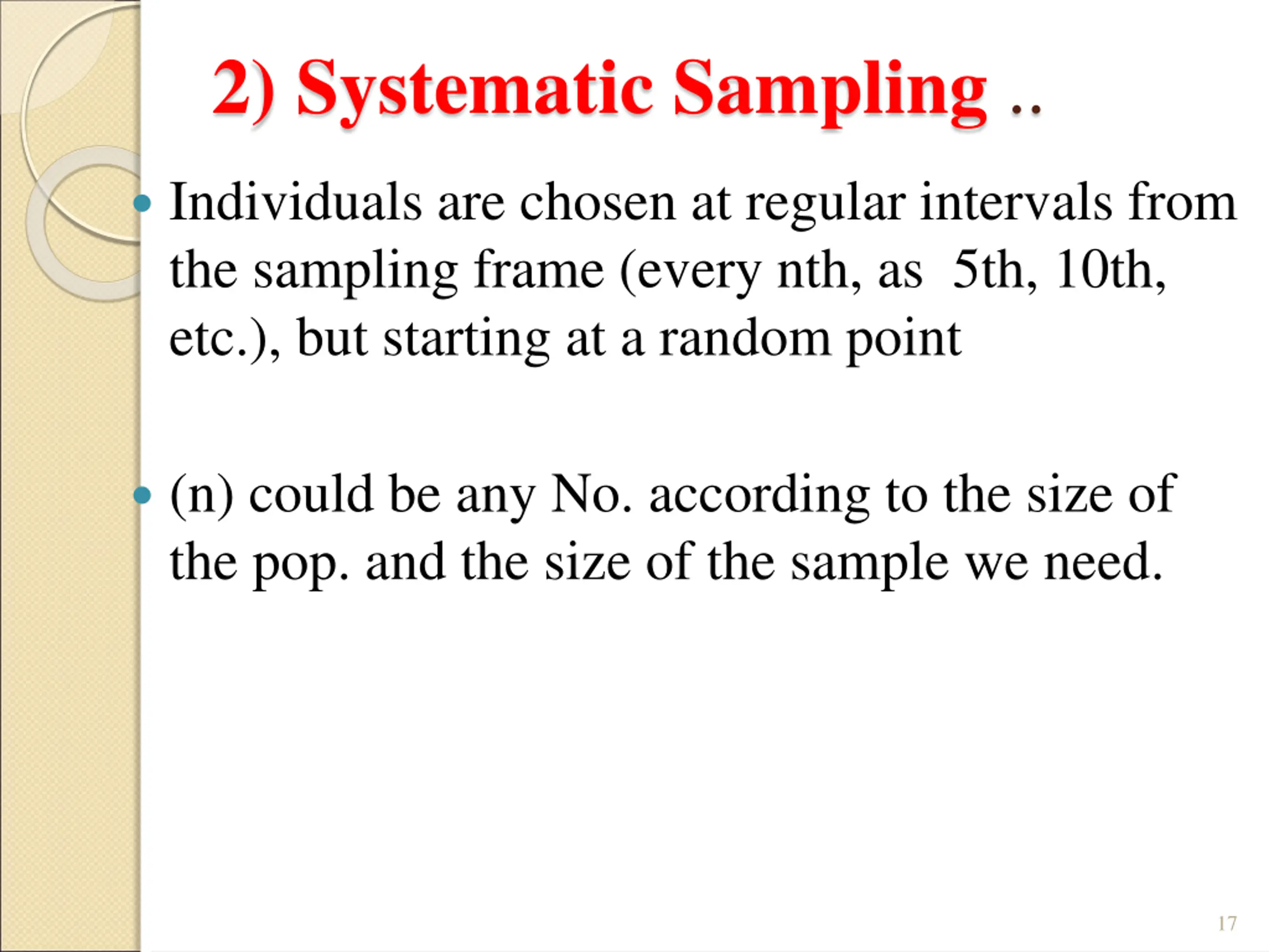 2) Systematic Sampling .. Individuals are chosen at regular intervals from the sampling frame (every nth, as 5th, 10th, etc.), but starting at a random point (n) could be any No. according to the size of the pop. and the size of the sample we need. 17