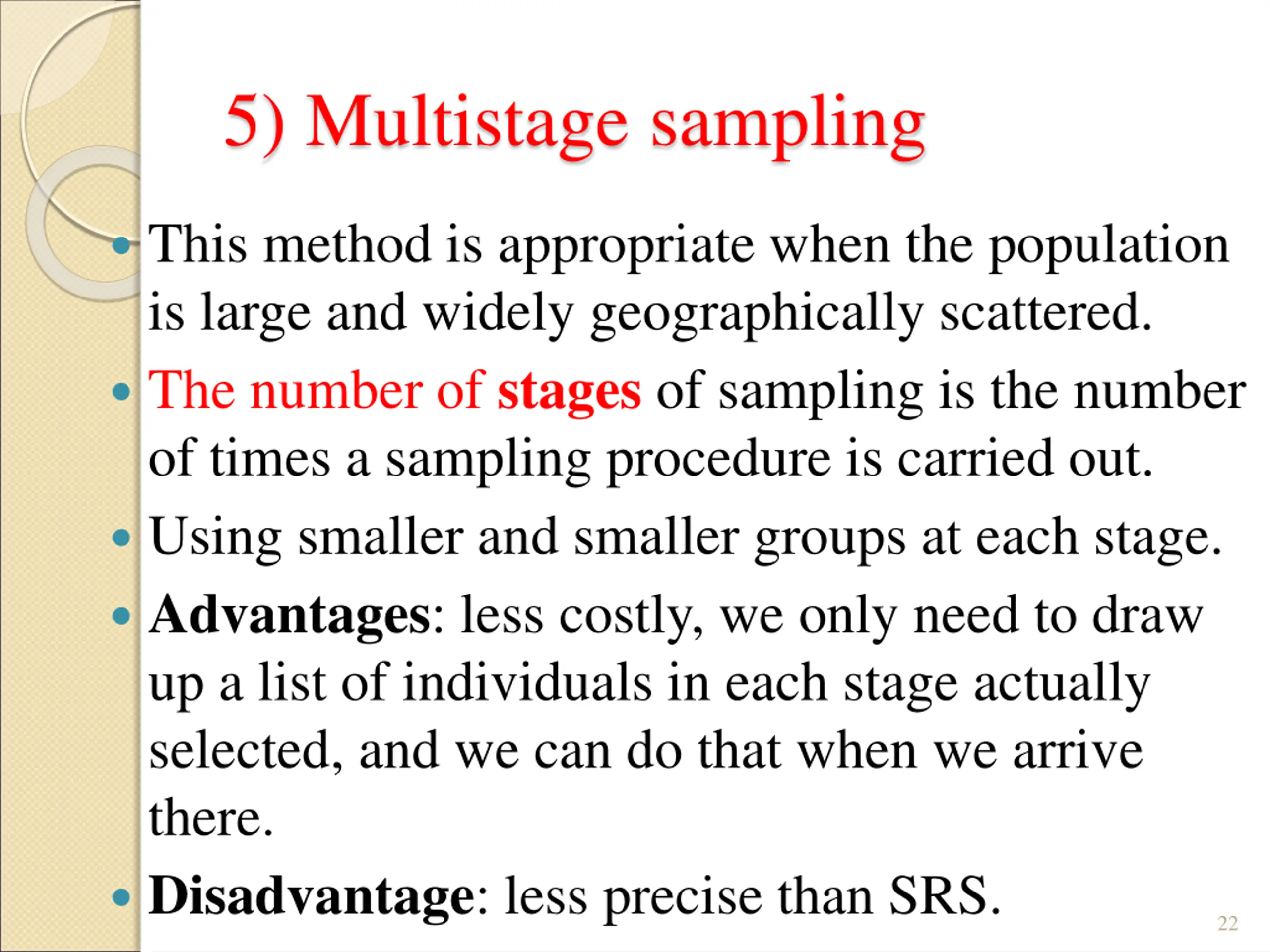 5) Multistage sampling This method is appropriate when the population is large and widely geographically scattered. The number of stages of sampling is the number of times a sampling procedure is carried out. Using smaller and smaller groups at each stage. Advantages: less costly, we only need to draw up a list of individuals in each stage actually selected, and we can do that when we arrive there. Disadvantage: less precise than SRS. 22