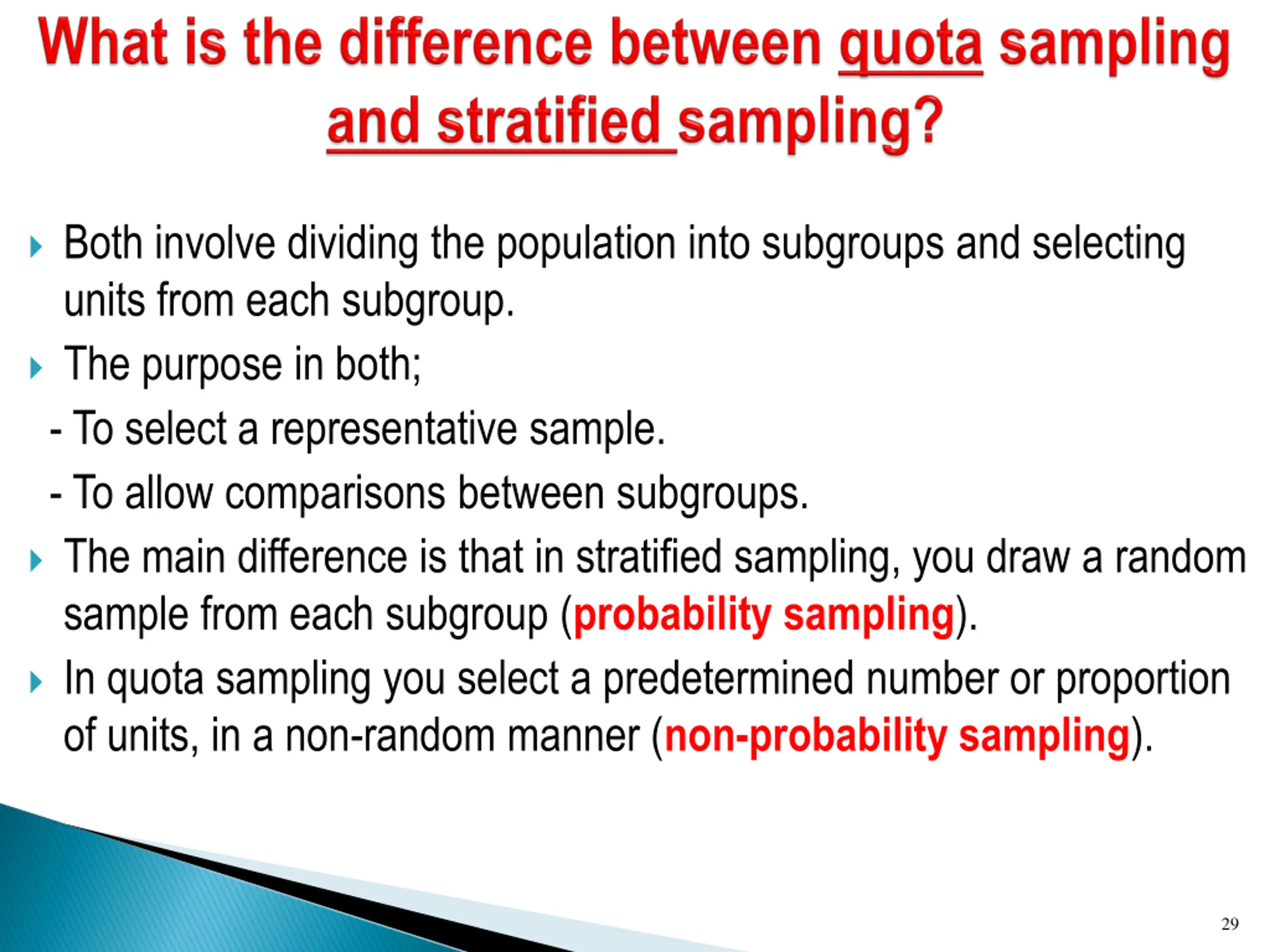 Both involve dividing the population into subgroups and selecting units from each subgroup. The purpose in both; - To select a representative sample. - To allow comparisons between subgroups. The main difference is that in stratified sampling, you draw a random sample from each subgroup (probability sampling). In quota sampling you select a predetermined number or proportion of units, in a non-random manner (non-probability sampling). 29