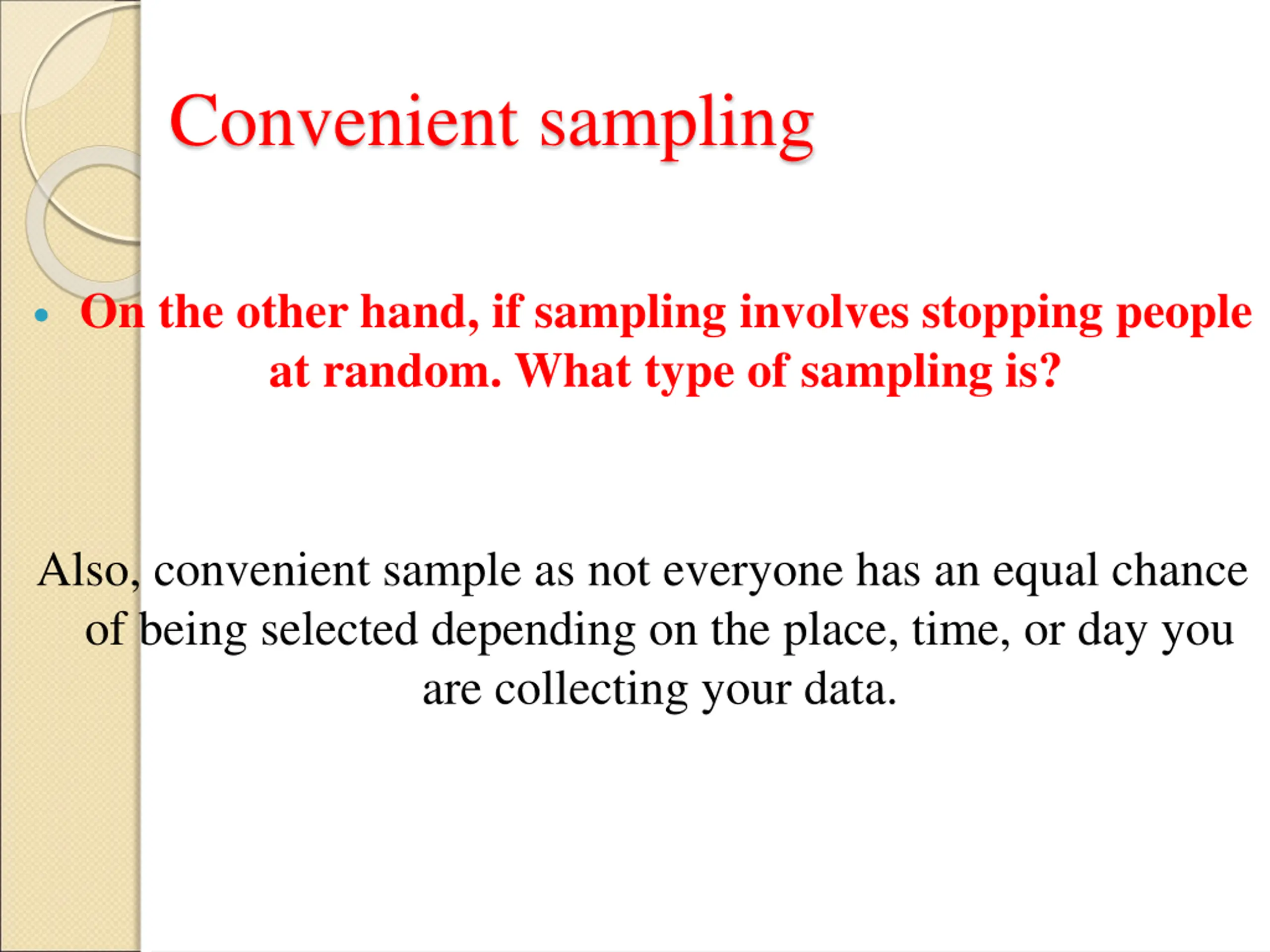 Convenient sampling On the other hand, if sampling involves stopping people at random. What type of sampling is? Also, convenient sample as not everyone has an equal chance of being selected depending on the place, time, or day you are collecting your data.
