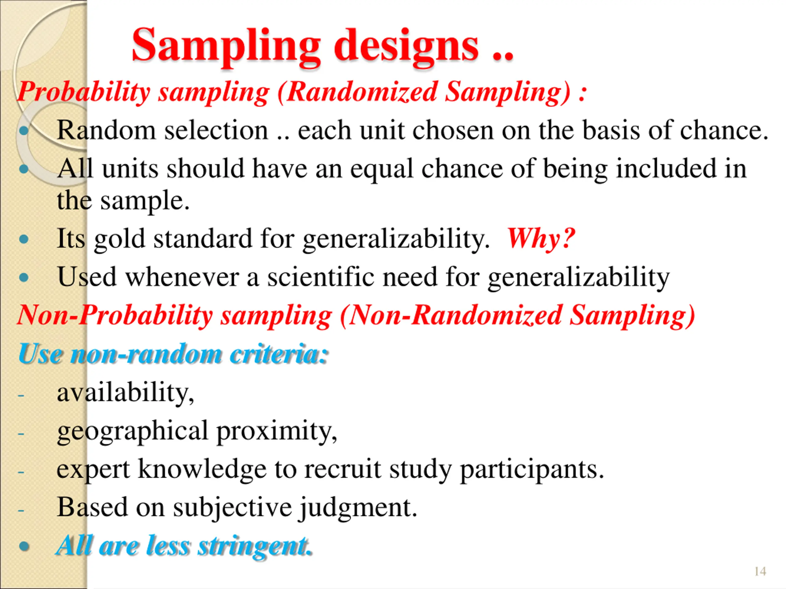 Sampling designs .. Probability sampling (Randomized Sampling) : Random selection .. each unit chosen on the basis of chance. All units should have an equal chance of being included in the sample. Its gold standard for generalizability. Why? Used whenever a scientific need for generalizability Non-Probability sampling (Non-Randomized Sampling) Use non-random criteria: - availability, - geographical proximity, - expert knowledge to recruit study participants. - Based on subjective judgment. All are less stringent. 14