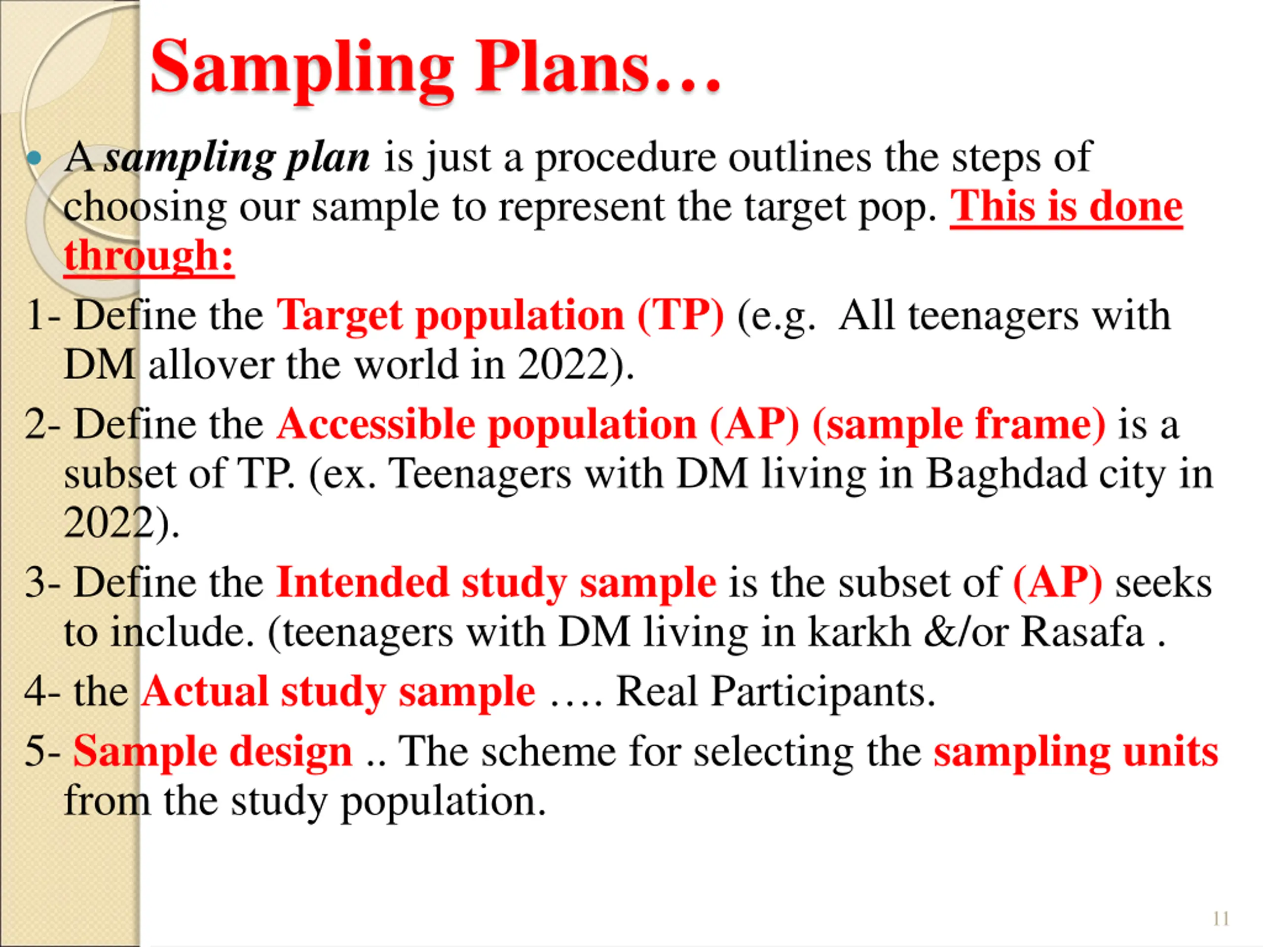 Sampling Plans A sampling plan is just a procedure outlines the steps of choosing our sample to represent the target pop. This is done through: 1- Define the Target population (TP) (e.g. All teenagers with DM allover the world in 2022). 2- Define the Accessible population (AP) (sample frame) is a subset of TP. (ex. Teenagers with DM living in Baghdad city in 2022). 3- Define the Intended study sample is the subset of (AP) seeks to include. (teenagers with DM living in karkh &/or Rasafa . 4- the Actual study sample . Real Participants. 5- Sample design .. The scheme for selecting the sampling units from the study population. 11