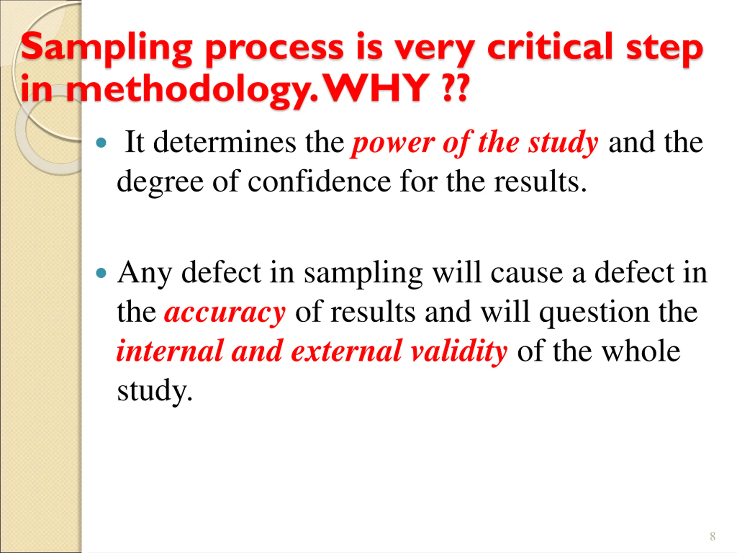 Sampling process is very critical step in methodology. WHY ?? It determines the power of the study and the degree of confidence for the results. Any defect in sampling will cause a defect in the accuracy of results and will question the internal and external validity of the whole study. 8