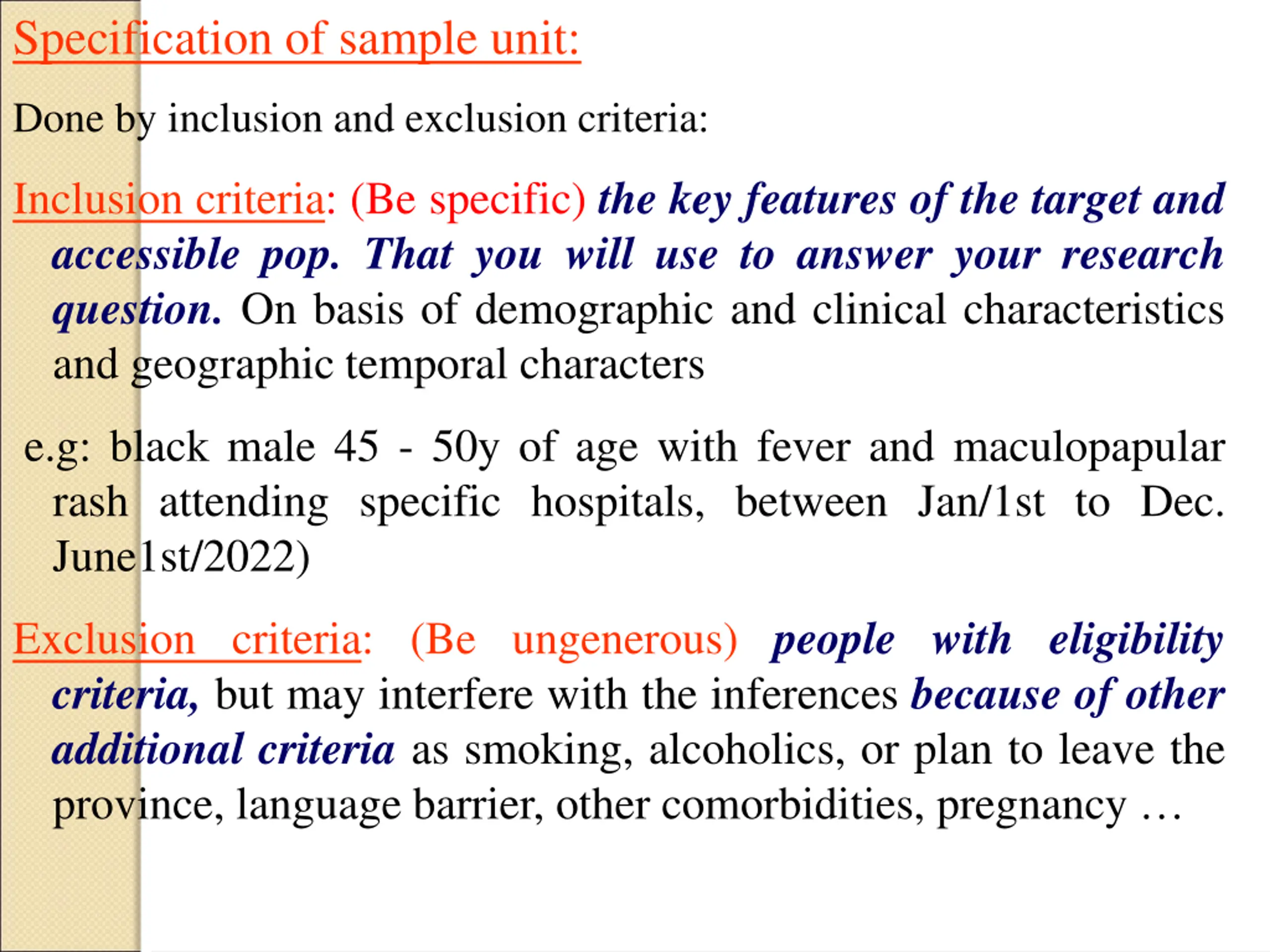 Specification of sample unit: Done by inclusion and exclusion criteria: Inclusion criteria: (Be specific) the key features of the target and accessible pop. That you will use to answer your research question. On basis of demographic and clinical characteristics and geographic temporal characters e.g: black male 45 - 50y of age with fever and maculopapular rash attending specific hospitals, between Jan/1st to Dec. June1st/2022) Exclusion criteria: (Be ungenerous) people with eligibility criteria, but may interfere with the inferences because of other additional criteria as smoking, alcoholics, or plan to leave the province, language barrier, other comorbidities, pregnancy