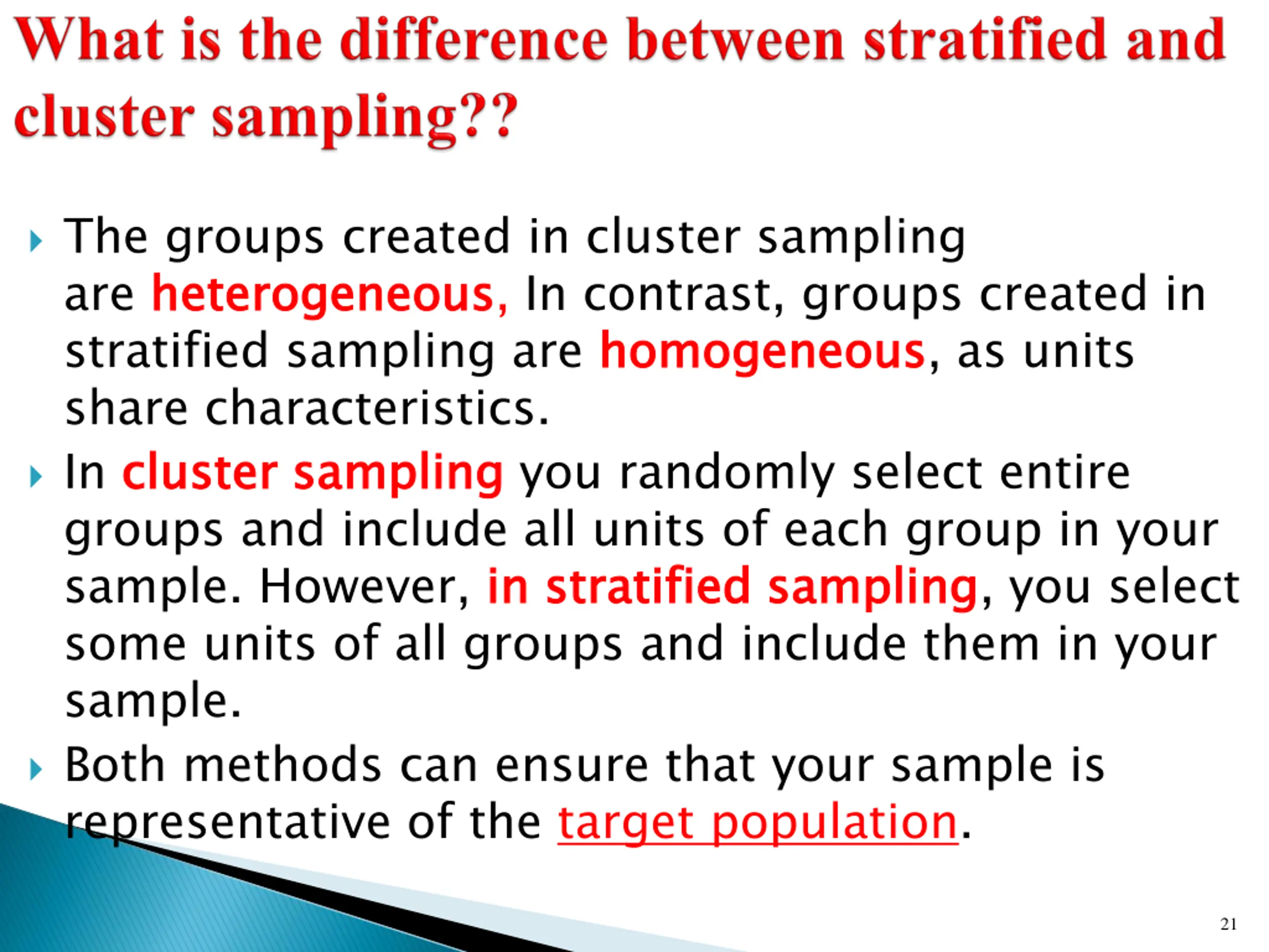 The groups created in cluster sampling are heterogeneous stratified sampling are homogeneous share characteristics. In cluster sampling groups and include all units of each group in your sample. However, in stratified sampling some units of all groups and include them in your sample. Both methods can ensure that your sample is representative of the target population. heterogeneous, In contrast, groups created in homogeneous, as units cluster sampling you randomly select entire in stratified sampling, you select 21