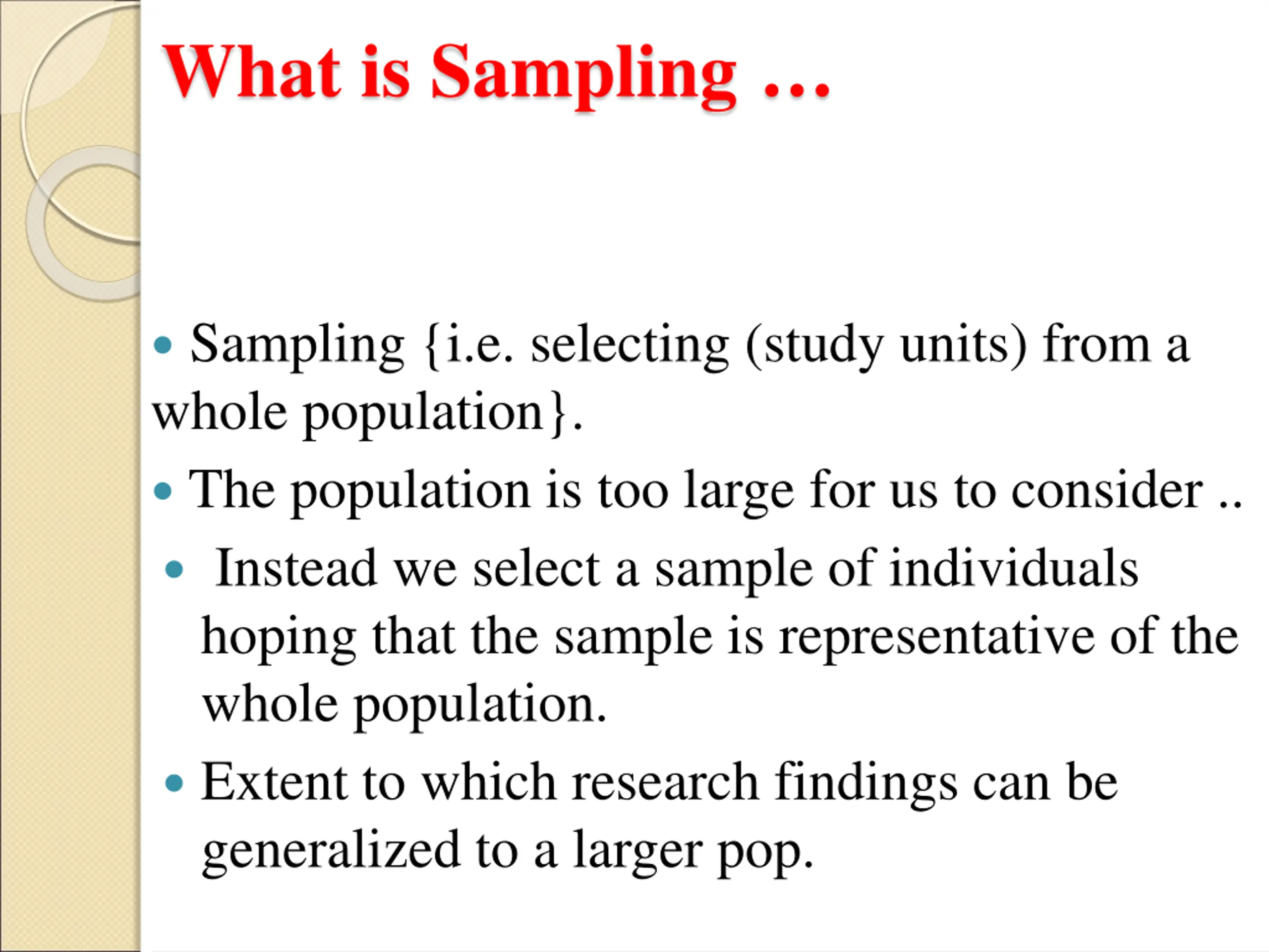 What is Sampling Sampling {i.e. selecting (study units) from a whole population}. The population is too large for us to consider .. Instead we select a sample of individuals hoping that the sample is representative of the whole population. Extent to which research findings can be generalized to a larger pop.