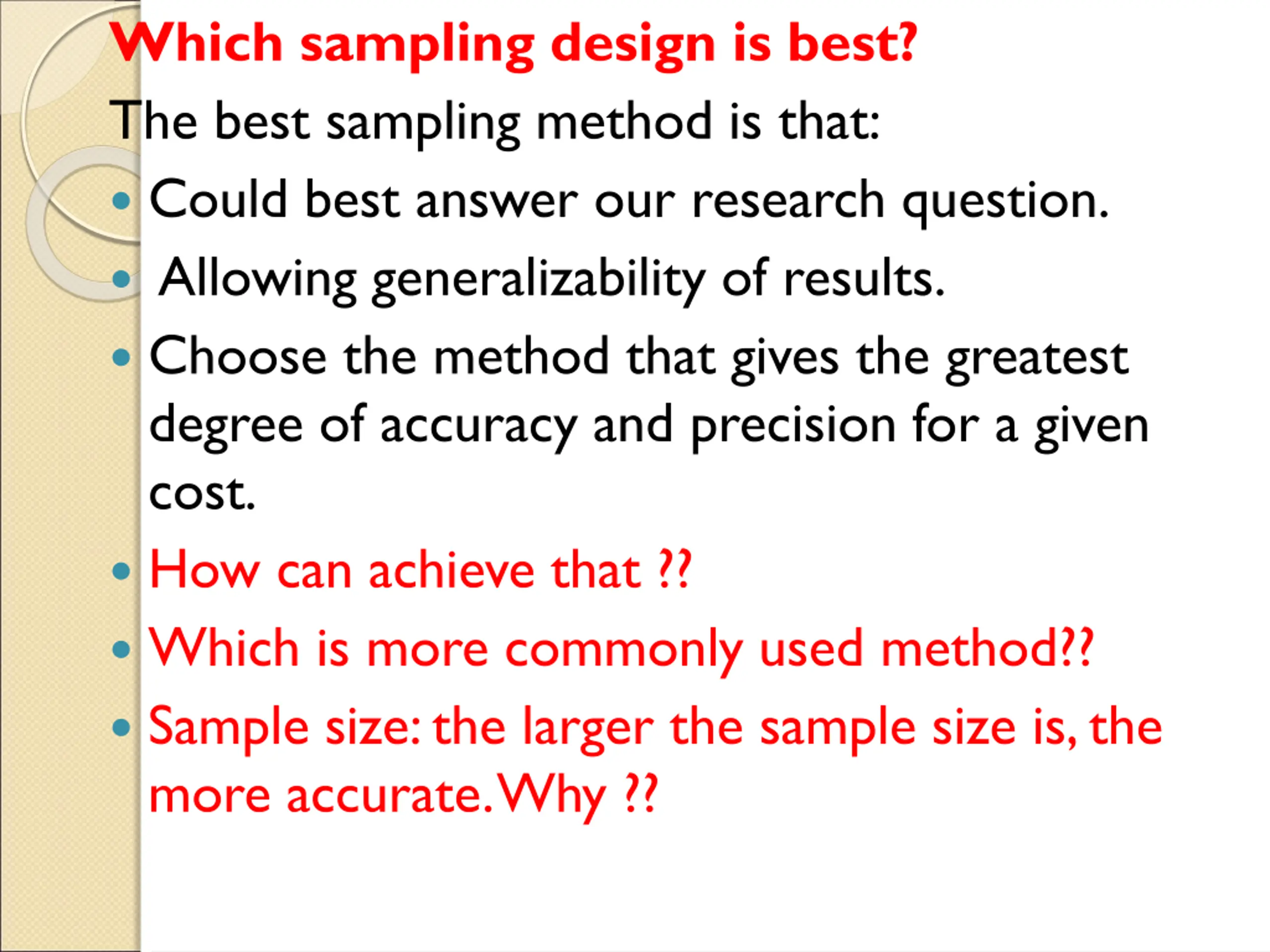 Which sampling design is best? The best sampling method is that: Could best answer our research question. Allowing generalizability of results. Choose the method that gives the greatest degree of accuracy and precision for a given cost. How can achieve that ?? Which is more commonly used method?? Sample size: the larger the sample size is, the more accurate. Why ??