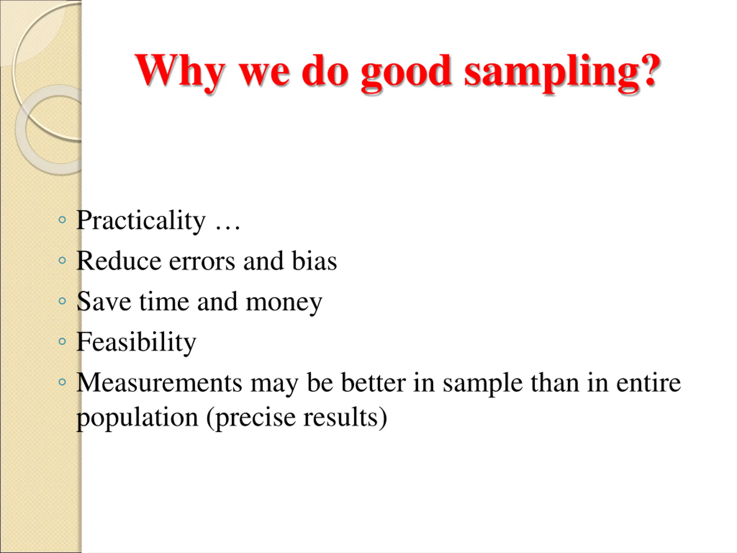 Why we do good sampling? Practicality Reduce errors and bias Save time and money Feasibility Measurements may be better in sample than in entire population (precise results)