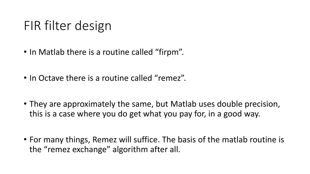 FIR filter design In Matlab there is a routine called firpm . In Octave there is a routine called remez . They are approximately the same, but Matlab uses double precision, this is a case where you do get what you pay for, in a good way. For many things, Remez will suffice. The basis of the matlab routine is the remez exchange algorithm after all.