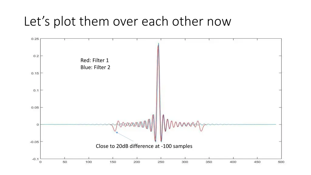 Lets plot them over each other now Red: Filter 1 Blue: Filter 2 Close to 20dB difference at -100 samples