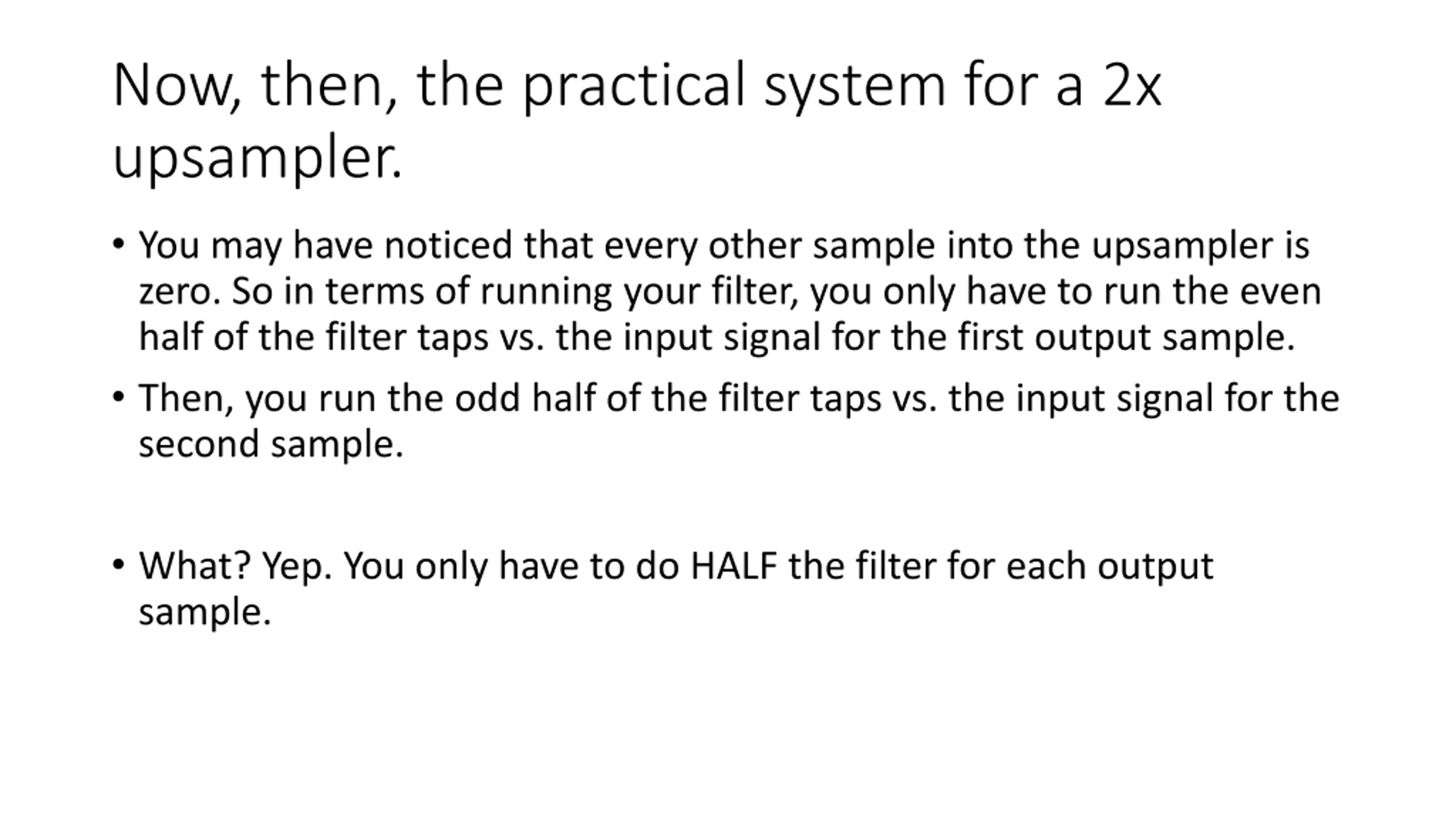Now, then, the practical system for a 2x upsampler. You may have noticed that every other sample into the upsampler is zero. So in terms of running your filter, you only have to run the even half of the filter taps vs. the input signal for the first output sample. Then, you run the odd half of the filter taps vs. the input signal for the second sample. What? Yep. You only have to do HALF the filter for each output sample.