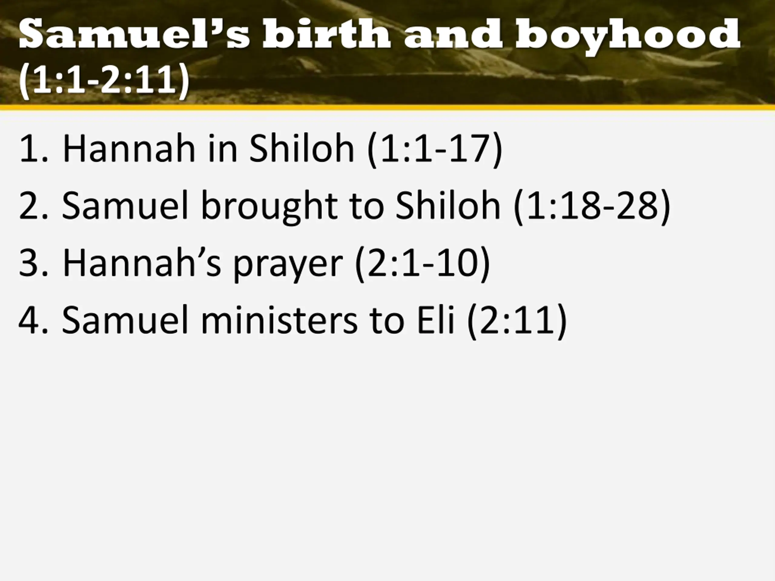 Samuels birth and boyhood (1:1-2:11) 1. Hannah in Shiloh (1:1-17) 2. Samuel brought to Shiloh (1:18-28) 3. Hannah s prayer (2:1-10) 4. Samuel ministers to Eli (2:11)