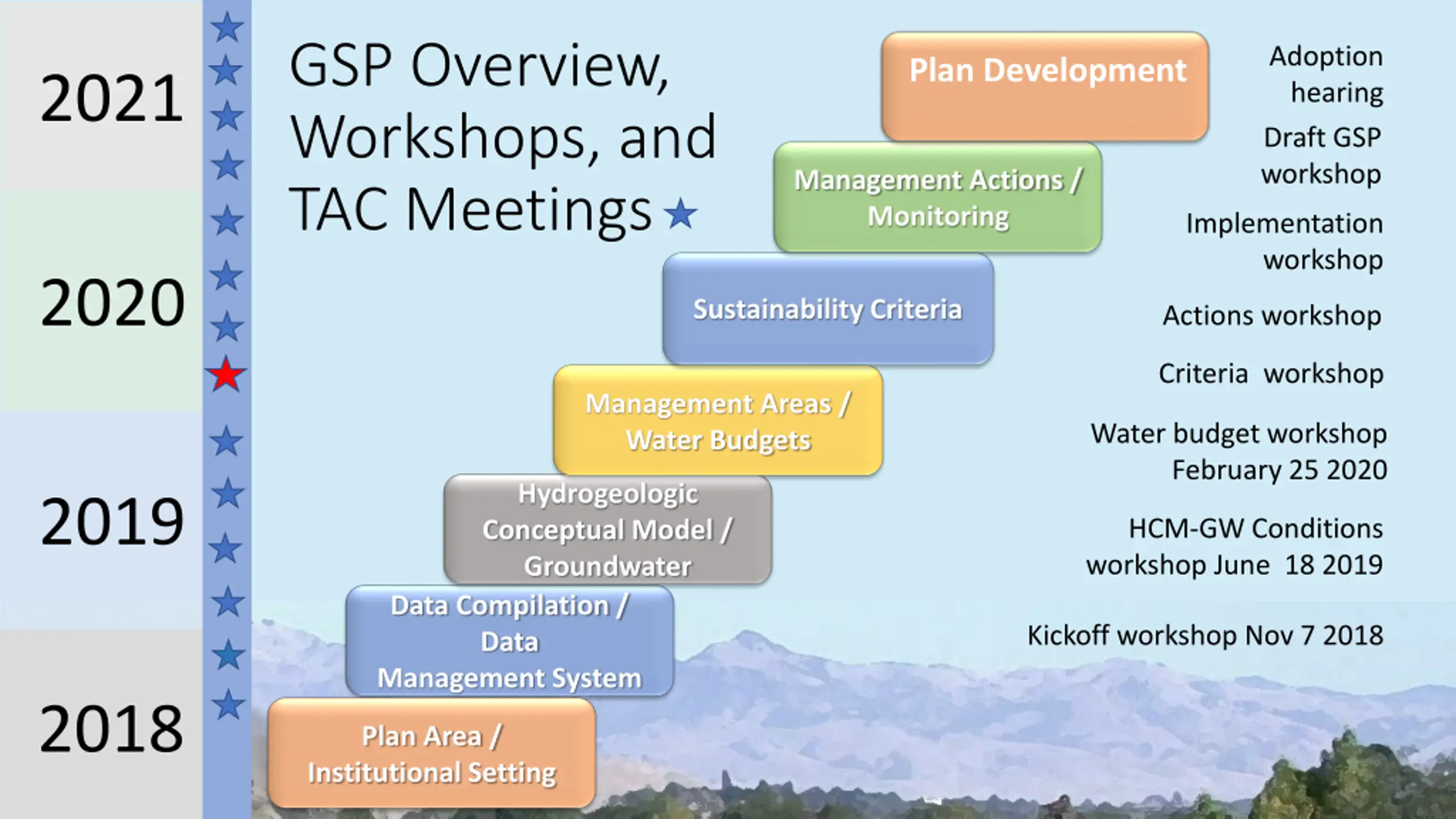 GSP Overview, Workshops, and TAC Meetings Adoption hearing Plan Development 2021 Draft GSP workshop Management Actions / Monitoring Implementation workshop 2020 Sustainability Criteria Actions workshop Criteria workshop Management Areas / Water Budgets Water budget workshop February 25 2020 Hydrogeologic Conceptual Model / Groundwater 2019 HCM-GW Conditions workshop June 18 2019 Data Compilation / Data Management System Kickoff workshop Nov 7 2018 2018 Plan Area / Institutional Setting