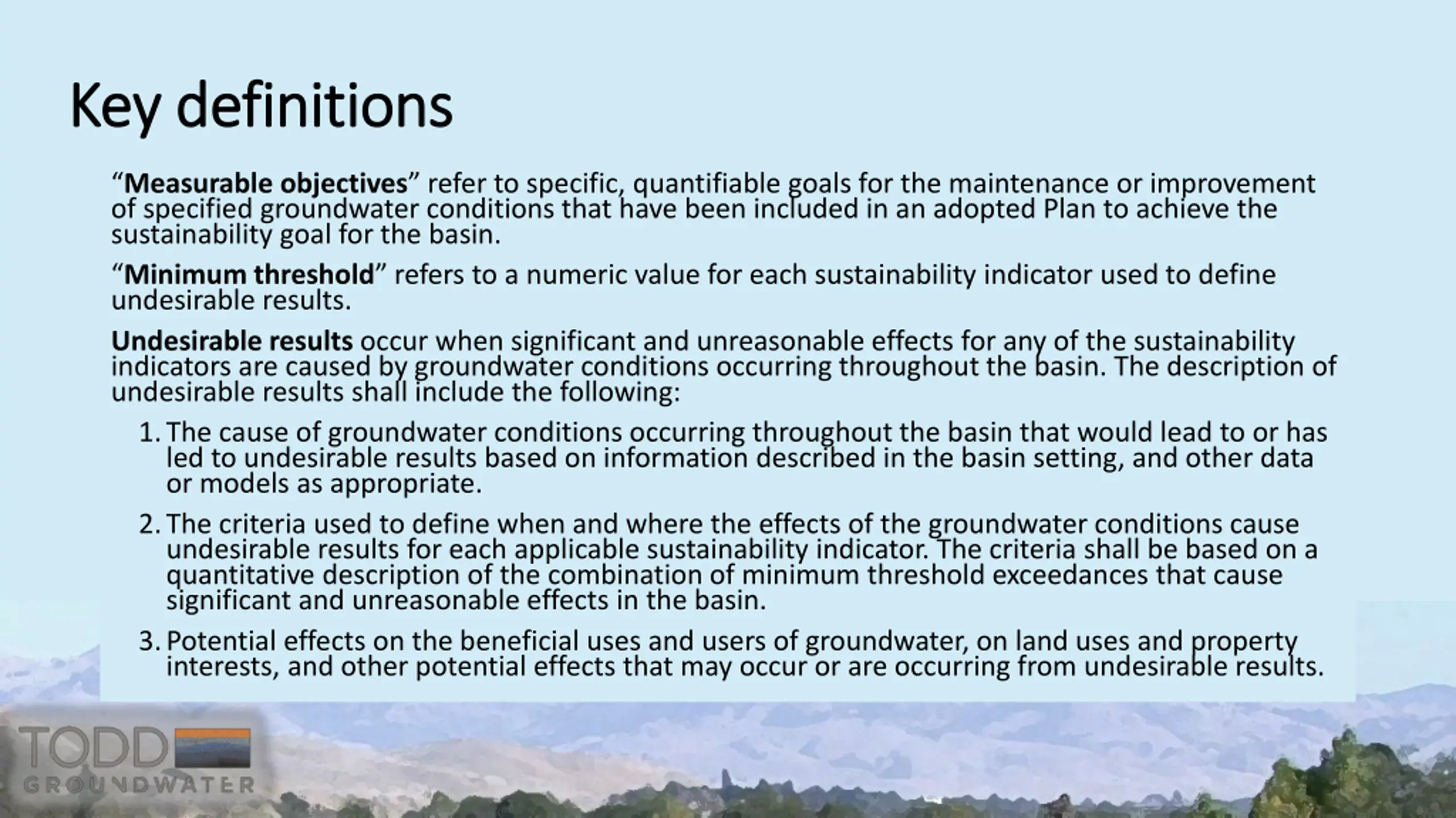 Key definitions Key definitions Measurable objectives refer to specific, quantifiable goals for the maintenance or improvement of specified groundwater conditions that have been included in an adopted Plan to achieve the sustainability goal for the basin. Minimum threshold refers to a numeric value for each sustainability indicator used to define undesirable results. Undesirable results occur when significant and unreasonable effects for any of the sustainability indicators are caused by groundwater conditions occurring throughout the basin. The description of undesirable results shall include the following: 1.The cause of groundwater conditions occurring throughout the basin that would lead to or has led to undesirable results based on information described in the basin setting, and other data or models as appropriate. 2.The criteria used to define when and where the effects of the groundwater conditions cause undesirable results for each applicable sustainability indicator. The criteria shall be based on a quantitative description of the combination of minimum threshold exceedances that cause significant and unreasonable effects in the basin. 3.Potential effects on the beneficial uses and users of groundwater, on land uses and property interests, and other potential effects that may occur or are occurring from undesirable results.