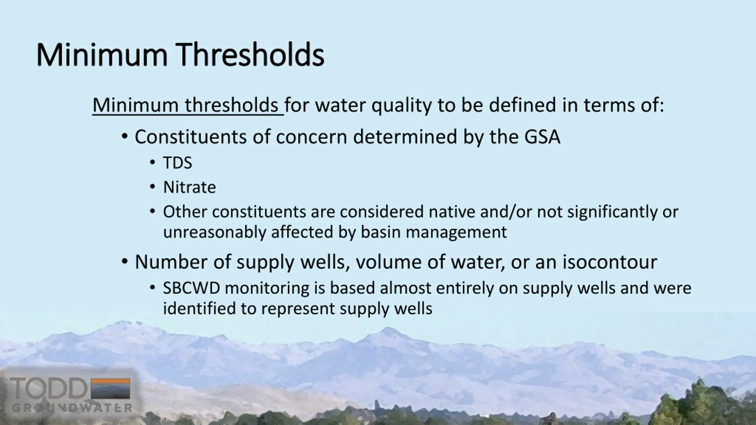 Minimum Thresholds Minimum Thresholds Minimum thresholds for water quality to be defined in terms of: Constituents of concern determined by the GSA TDS Nitrate Other constituents are considered native and/or not significantly or unreasonably affected by basin management Number of supply wells, volume of water, or an isocontour SBCWD monitoring is based almost entirely on supply wells and were identified to represent supply wells