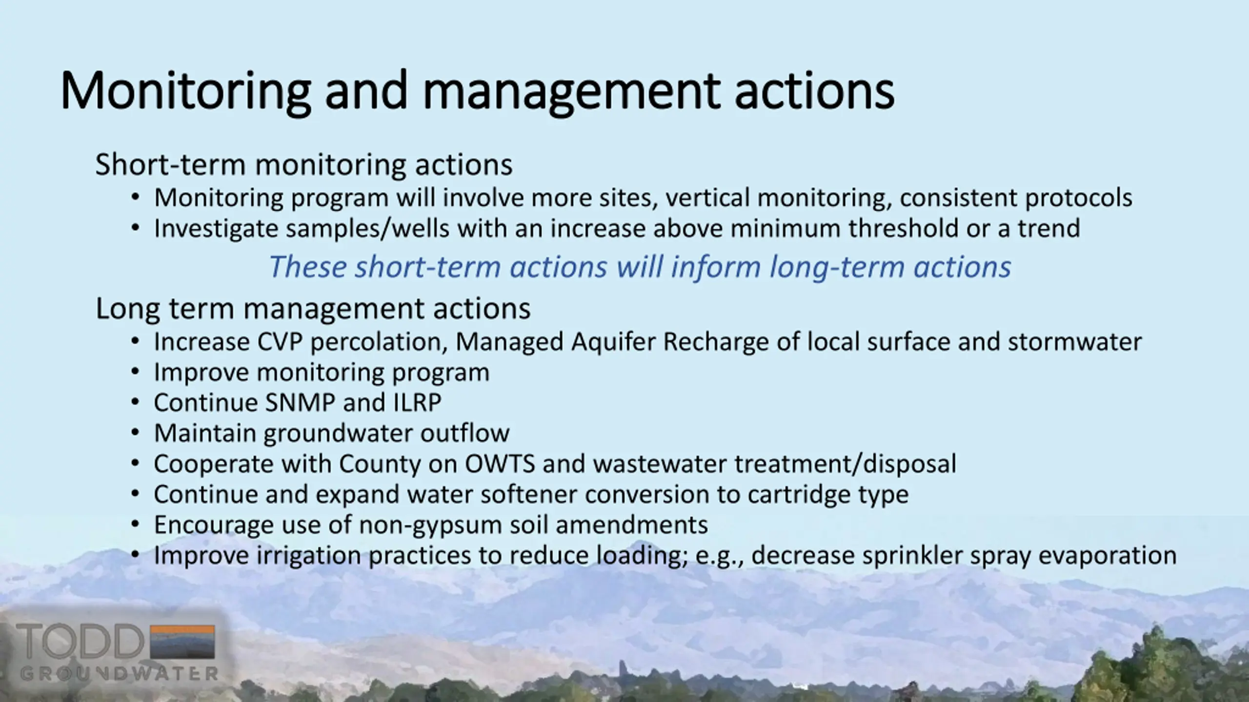 Monitoring and management actions Monitoring and management actions Short-term monitoring actions Monitoring program will involve more sites, vertical monitoring, consistent protocols Investigate samples/wells with an increase above minimum threshold or a trend These short-term actions will inform long-term actions Long term management actions Increase CVP percolation, Managed Aquifer Recharge of local surface and stormwater Improve monitoring program Continue SNMP and ILRP Maintain groundwater outflow Cooperate with County on OWTS and wastewater treatment/disposal Continue and expand water softener conversion to cartridge type Encourage use of non-gypsum soil amendments Improve irrigation practices to reduce loading; e.g., decrease sprinkler spray evaporation